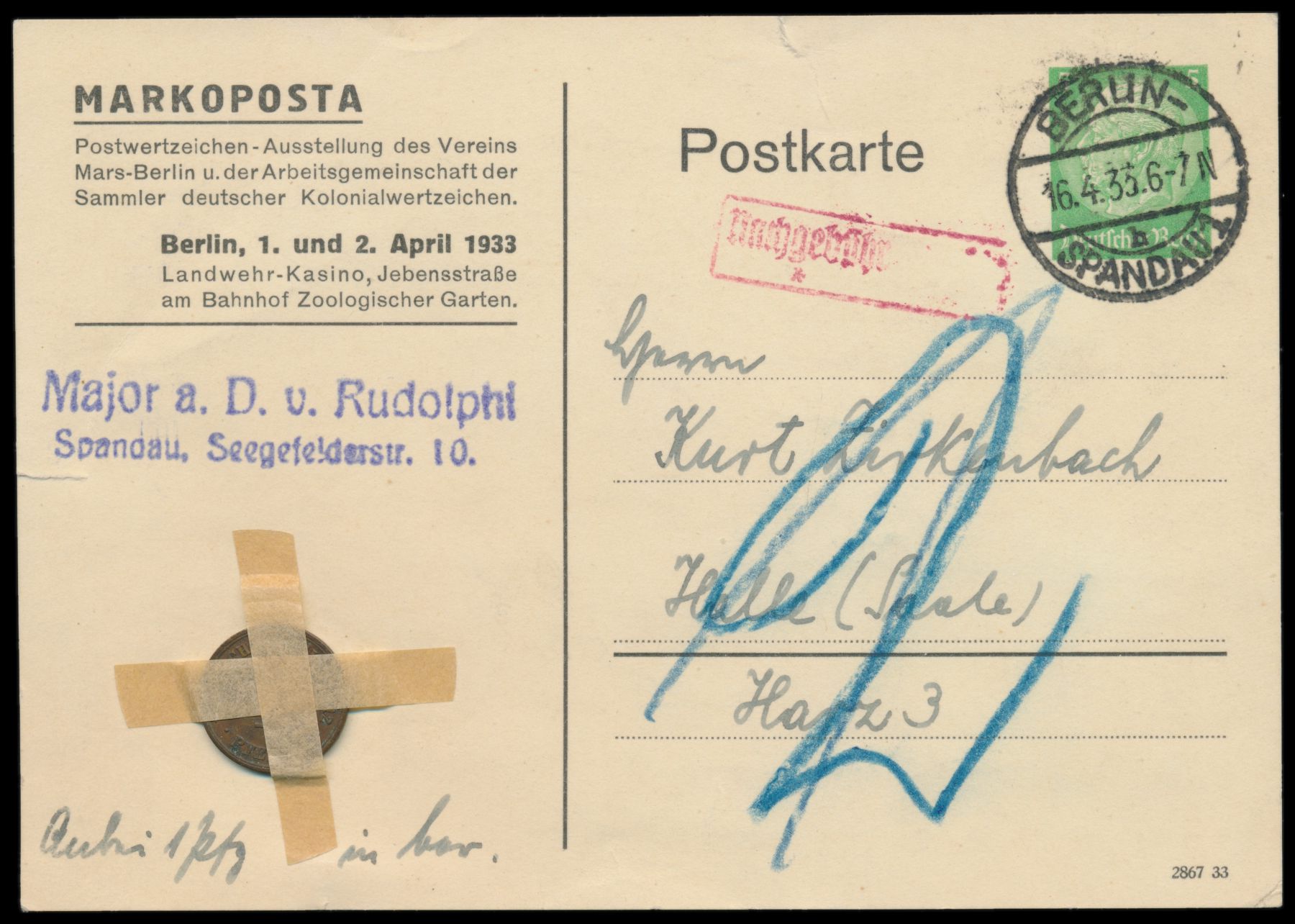 Privatganzsache 5 Pf. Hindenburg, Markoposta 1933, Frech B 1 / 02, Stempel Berlin-Spandau 1 16.4.33, links unten als Ersatz für 1 Pf.-Marke ein 1 Pf.-Geldstück mit Papierstreifen befestigt, roter R1 Nachgebühr und handschriftlich 2 Pf., an Zirkenbach in Halle, Absender "v. Rudolphi", rückseitig viel Text, links und oben zwei kleine Risse (5 mm)