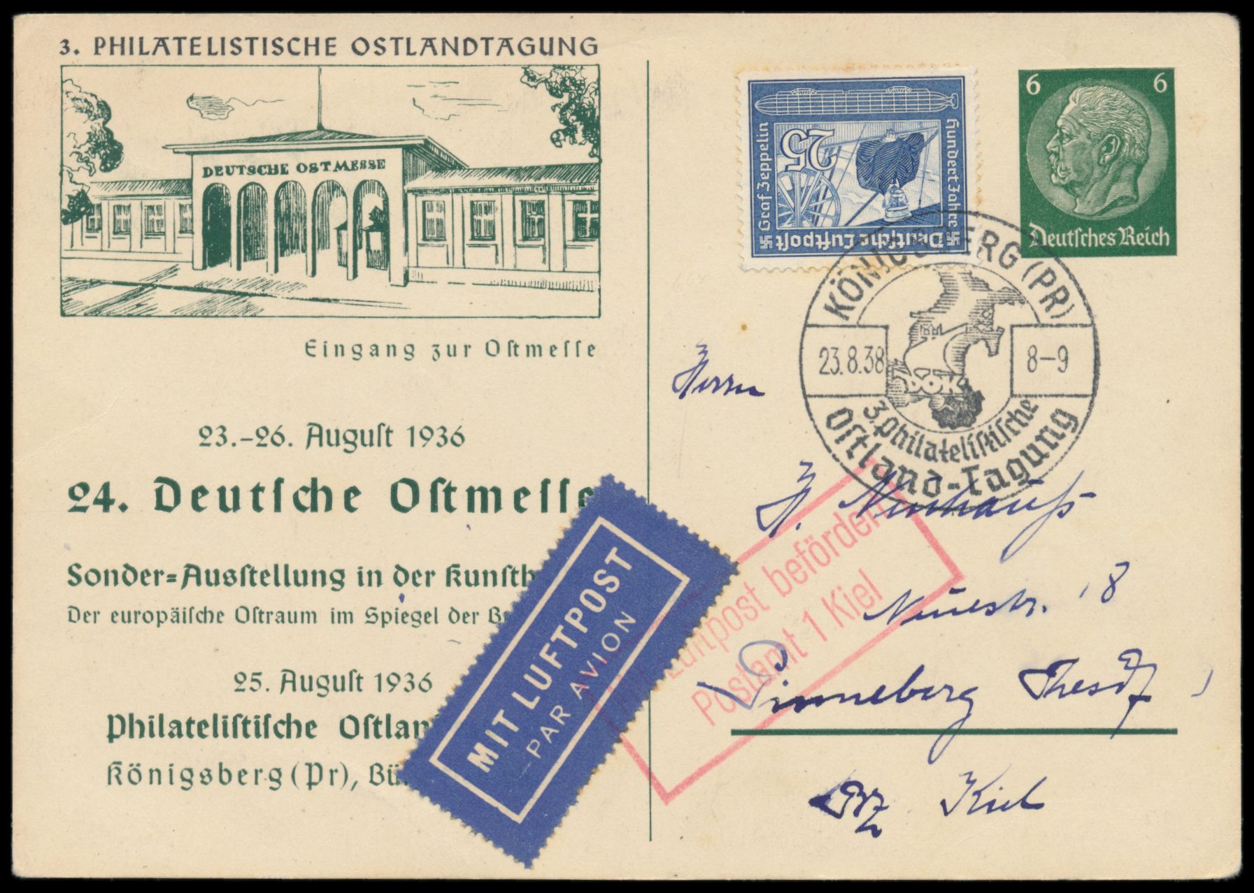 Privatganzsache 6 Pf. Hindenburg, Königsberg, 24. Deutsche Ostmesse, mit seltenem Zudruck " 3. Philatelistische Ostlandtagung", Frech C 21 / 02 = -.-, Zusatzfrankatur 25 Pf. Flugpost (etwas fleckig), Sonderstempel Königsberg (Pr.) Ostland-Tagung 23.8.38, als Luftpostkarte nach Pinneberg, roter R2 "Mit Luftpost befördert / Postamt 1 Kiel"