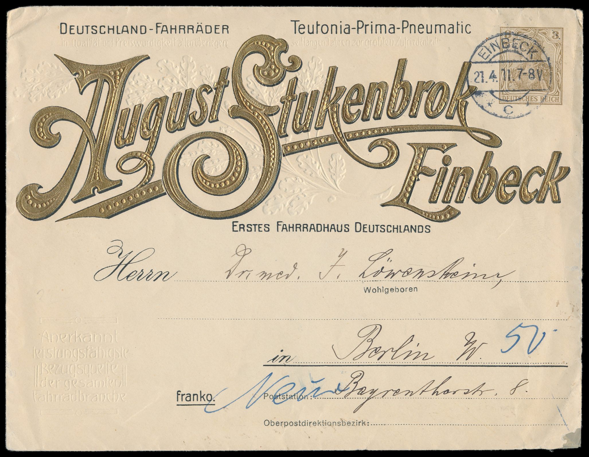Ganzsachen-Umschlag Stukenbrok, Bild B 25 Denkmal und Firmenansicht, Fahrrad-Versandhaus, Wertstempel 10 Pfg. Germania, Stempel Einback 7.4.03, nach Alsfeld, Ankunftsstempel 8.4., sauber, leichte Beförderungsspur