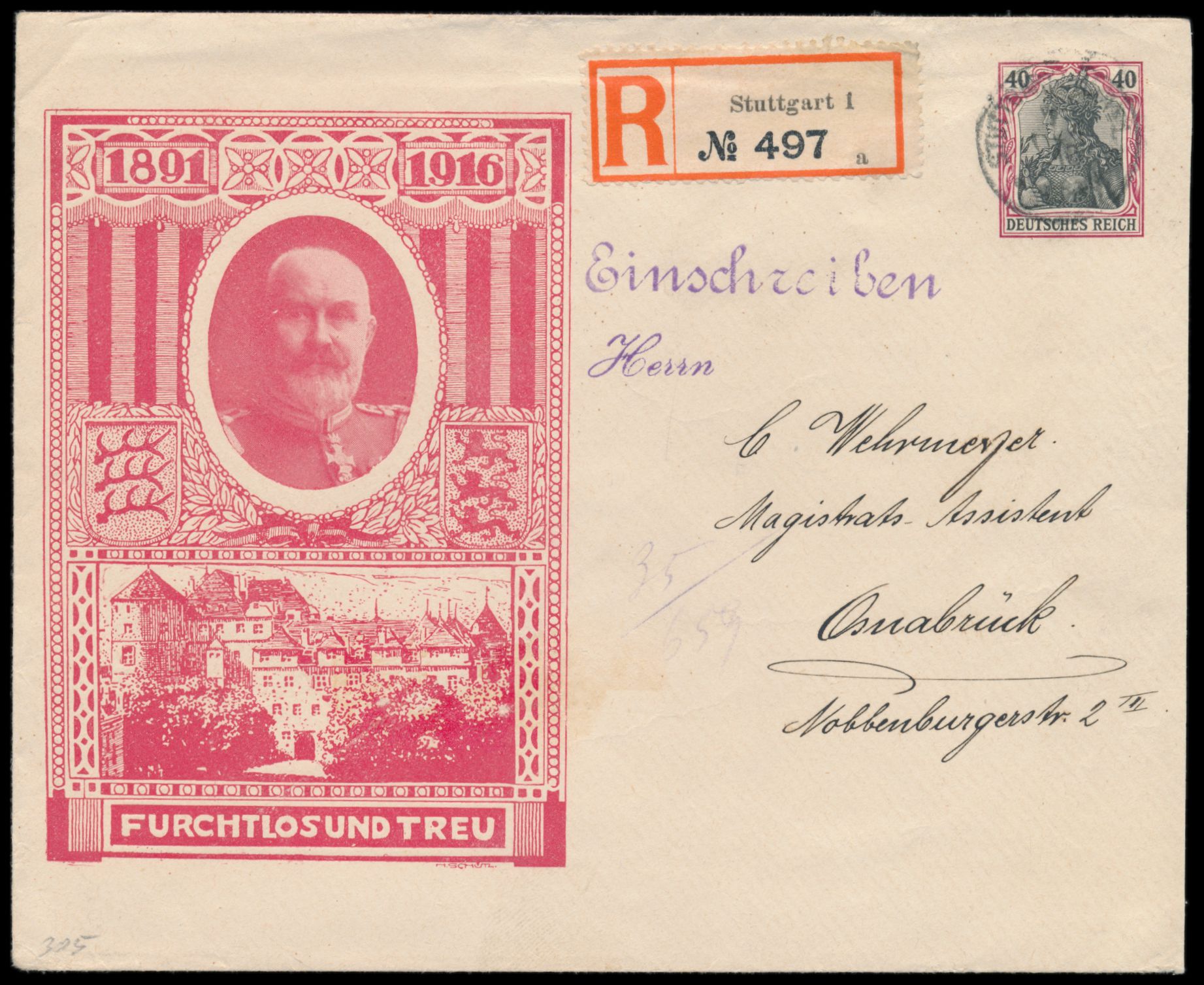 Privatganzsachenumschlag mit Wertstempel 40 Pf. Germania, Württembergisches Thronjubiläum, als Einschreiben nach Osnabrück, Stempel Stuttgart 1 9.10.16, Strahlendorff / Mette PU 31 C 1