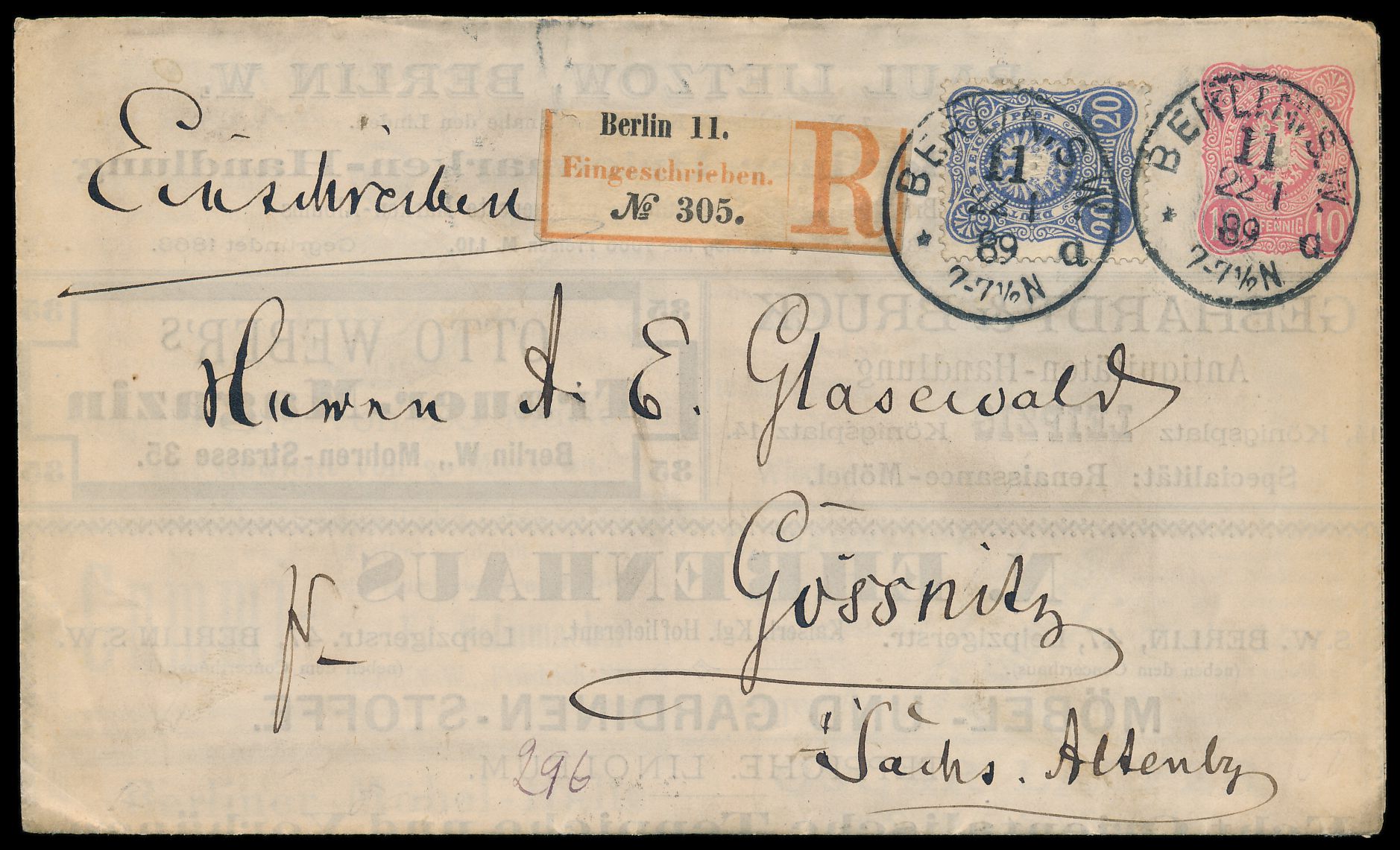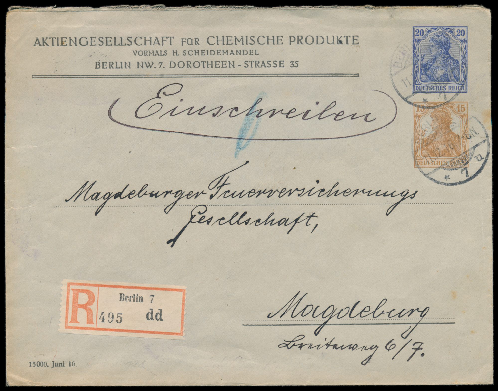 Privatganzsachenumschlag mit Wertstempel 20 Pf. blau und 15 Pf. braun, Aktiengesellschaft für Chemische Produkte, vormals H. Scheidemandel, Berlin ..., Strahlendorf / Mette PU 45 B 1, einzige Ganzsache mit dieser Wertstempel-Kombination, als Einschreiben mit Stempel Berlin NW 7 11.12.16 nach Magdeburg, Selbstbucher-R-Zettel mit UB dd, Ankunftstempel 12.12.16, Bedarf