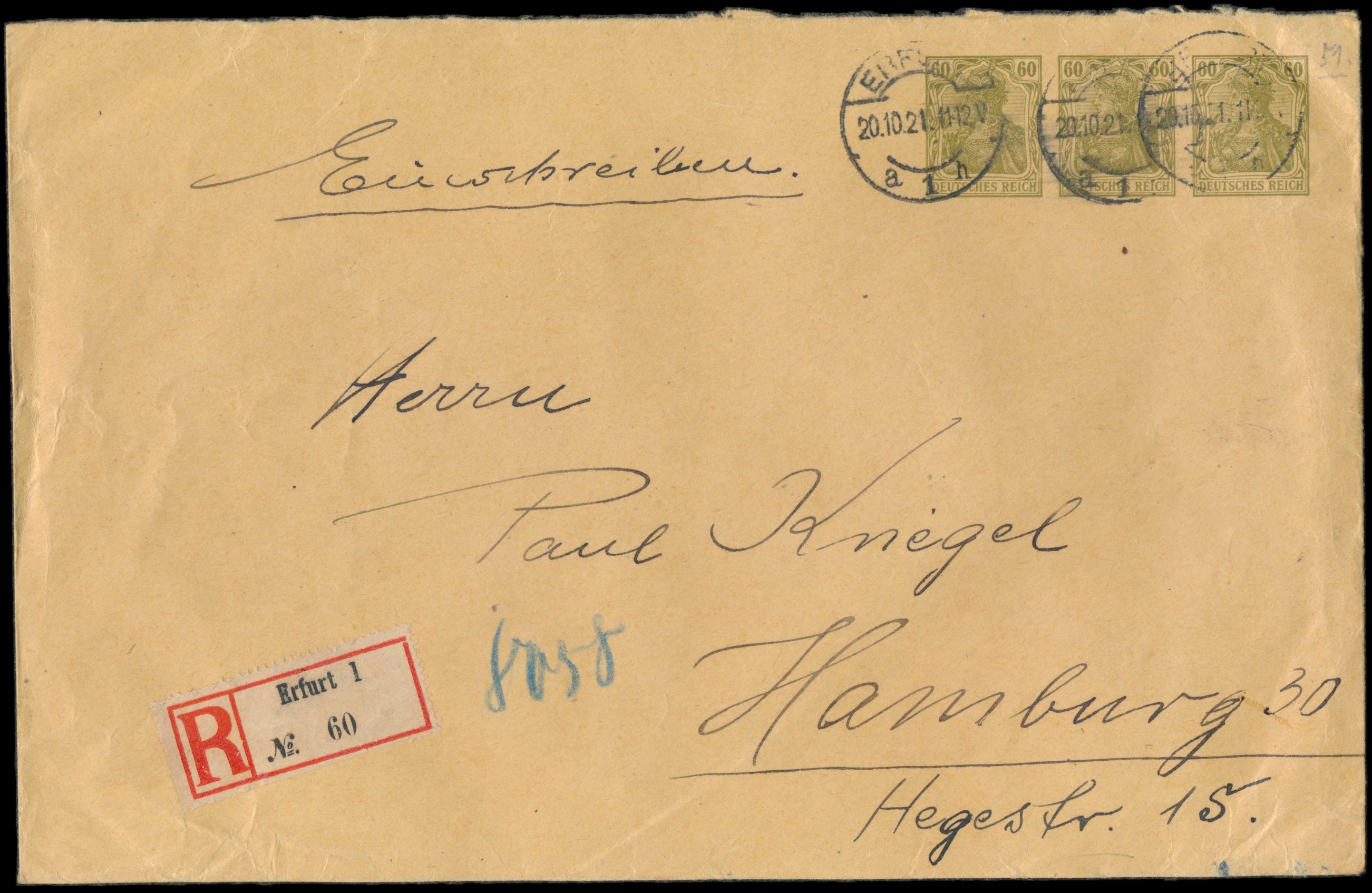2 großformatige Privat-Ganzsachenumschläge mit drei Wertstempeln zu 60 Pf. olivgrün, Strahlendorf / Mette PU 55 A 1, 1 x ungebraucht und 1 x als Einschreibbrief 2. Gewicht von Erfurt 20.10.21 nach Hamburg, Ankunftstempel 21.10.21, seltene portorichtige Verwendung ohne Zusatzfrankatur