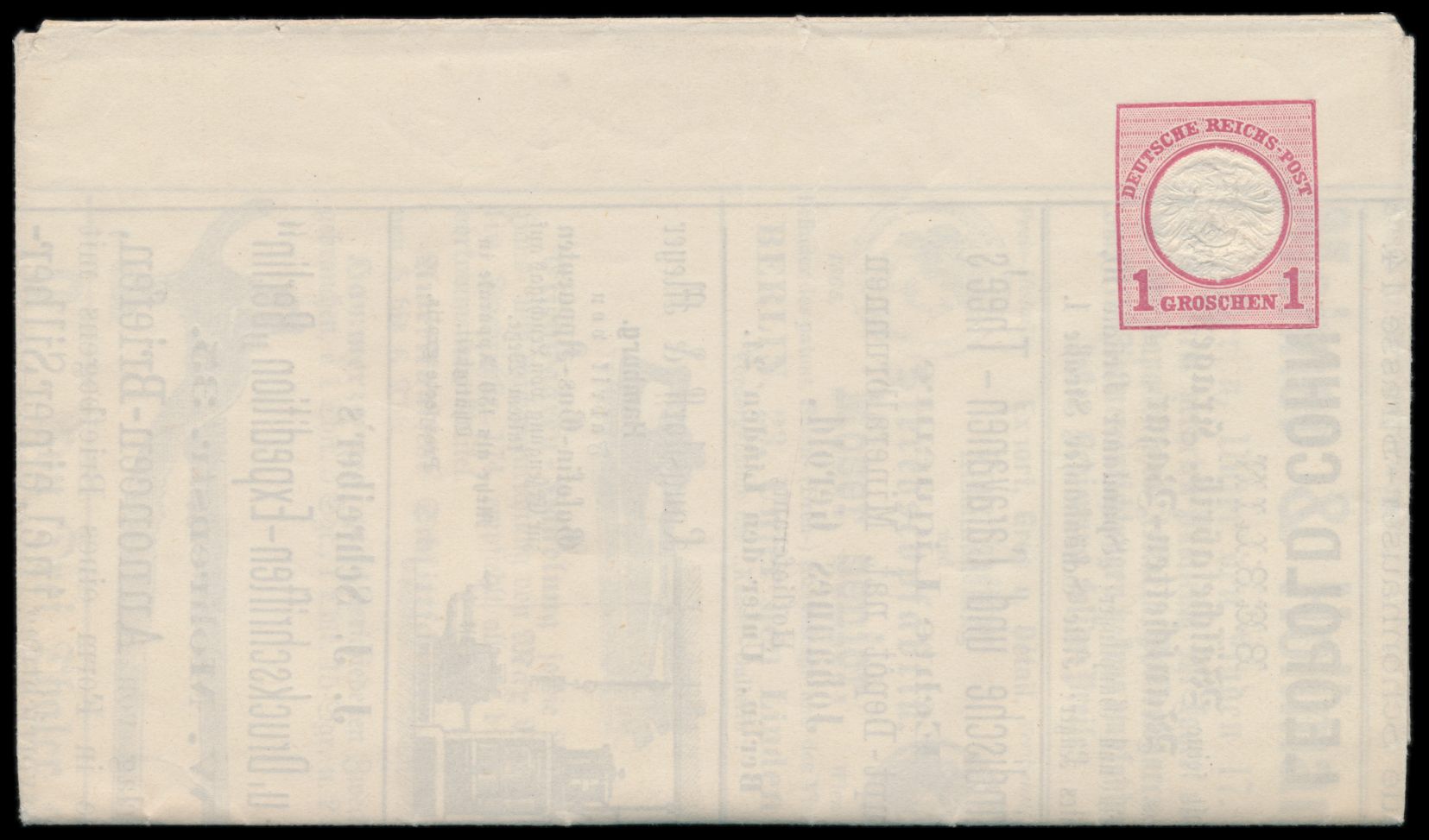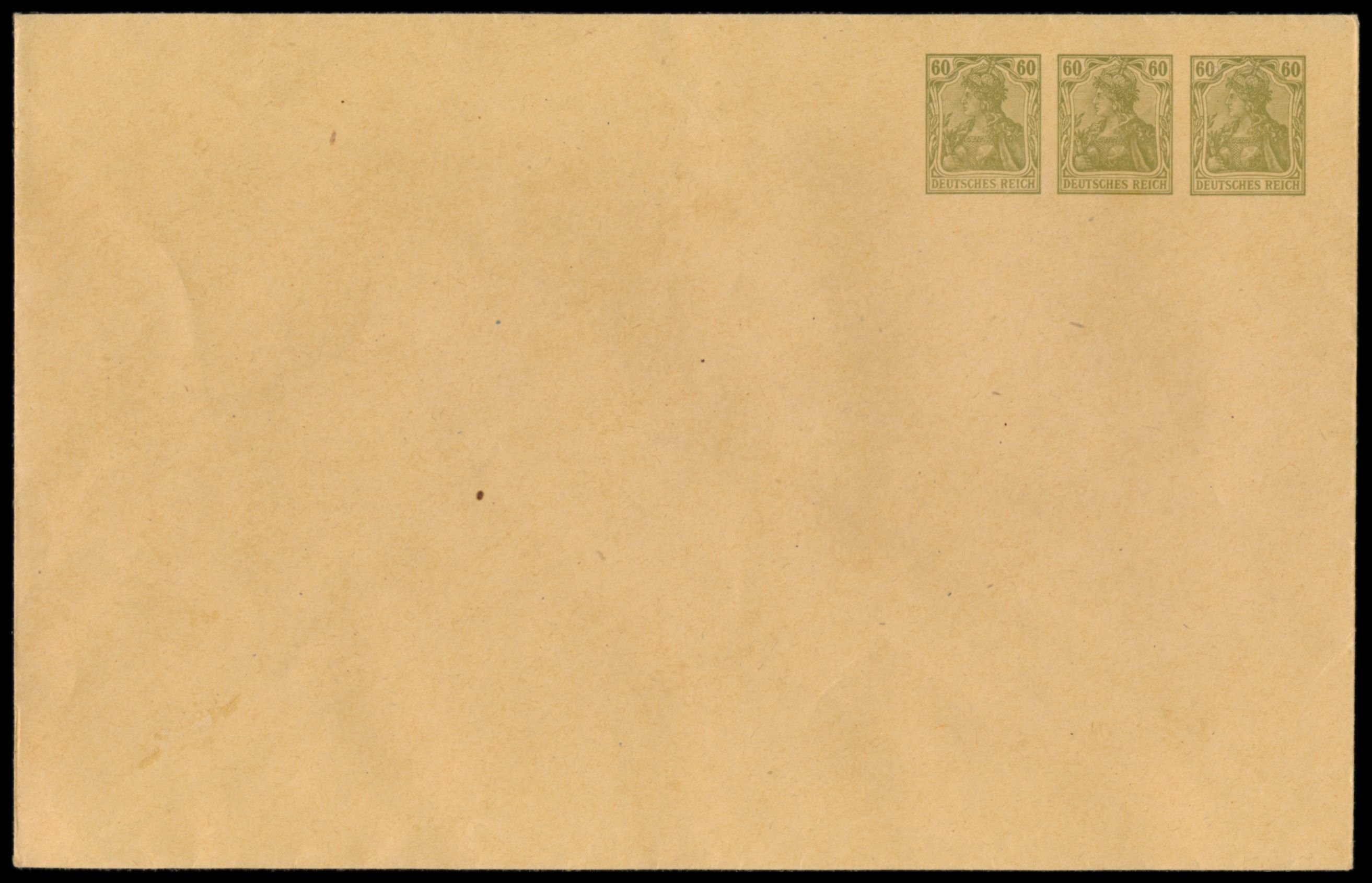 Privat-Ganzsachenumschlag "Carl Francke, Bremen" mit Wertstempel 50 Pf. Germania violett / schwarz, Format 25 x 17 cm, in Literatur (Strahlendorff / Mette) erwähnt, aber bisher nicht belegt, Zusatzfrankatur 2 x 5 Pf., Stempel Berlin W 50 12.10.20, nach Bremen, senkrecht und waagerecht gefaltet (verwendet als Rückumschlag), möglicherweise Unikat
