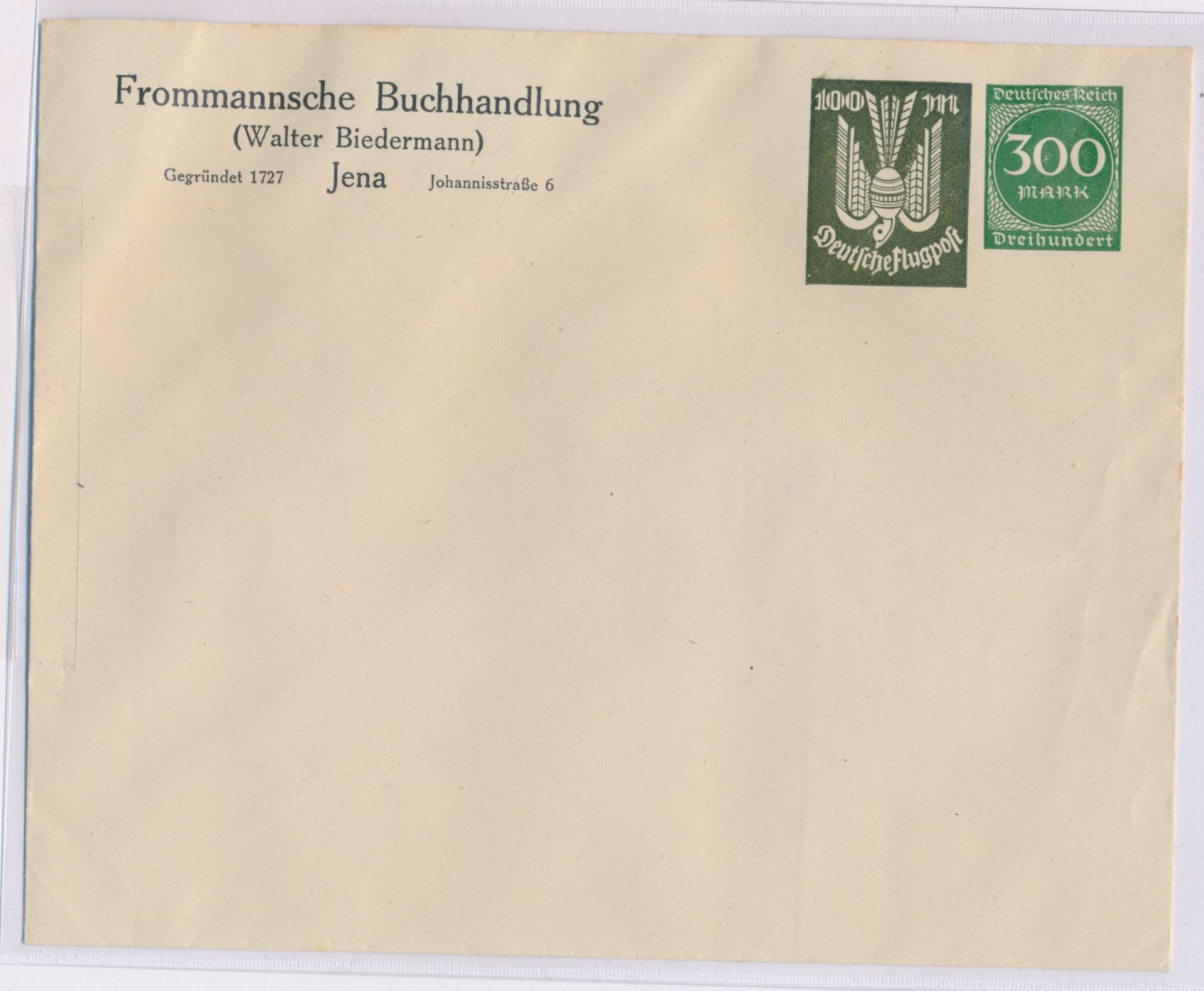 Privat-Ganzsachenumschlag mit Wertstempel 300 M. Ziffer und 100 M. Holztaube, Absender "Frommannsche Buchhandlung ... Jena", Strahlendorff / Mette PU 97 B 1, ungebraucht