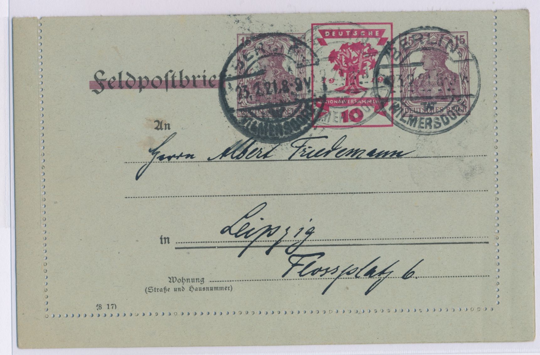 Feldpost-Kartenbrief (Feldheer) mit Wertstempel-Zudrucken 2 x 15 Pf. Germania und 10 Pf. Nationalversammlung, Strahlendorff / Mette PK 7 / E 1 /01, Stempel Berlin-Wilmersdorf 3.2.21, nach Leipzig, mit Rand, Bedarf