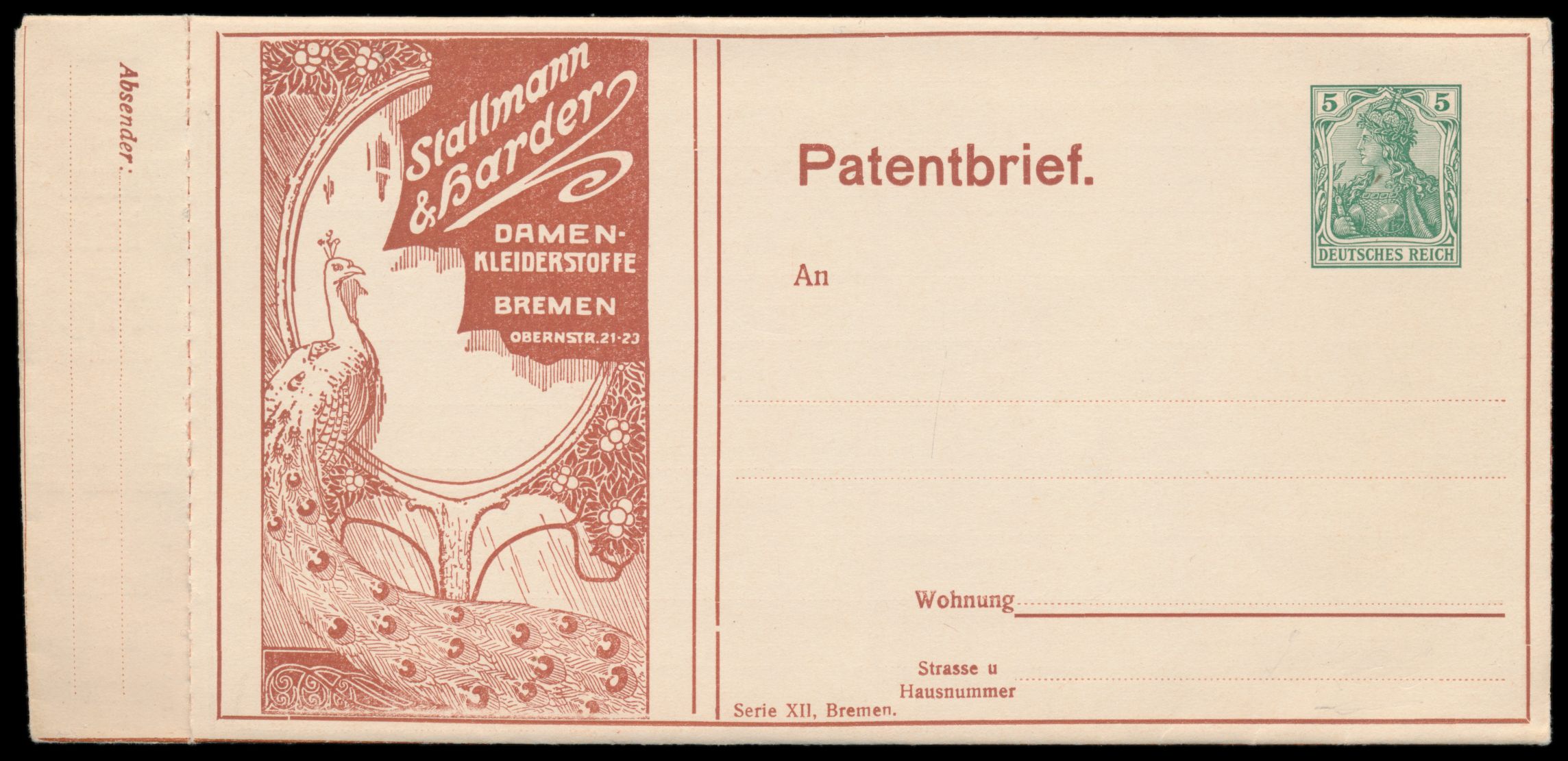 Patentbrief, Wertstempel 5 Pfg. Germania, Anzeigen Kartenbrief Serie XII Bremen, ungebraucht, vorderseitig Bild Stallmann Harder mit Pfau, gut erhalten