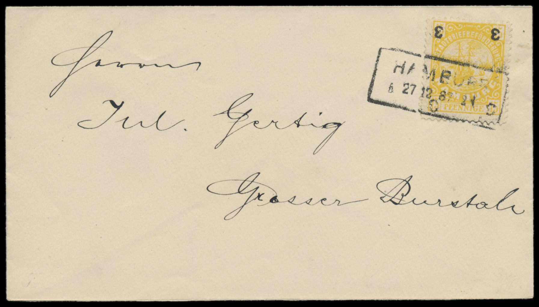 Hamburg, Stadtbriefbeförderung: Aufdruckmarke 3 auf 15 Pf., unten Aufdruck fehlend, oben Wertziffer kopfstehend, Brief mit Rahmenstempel Hamburg 27.12.87