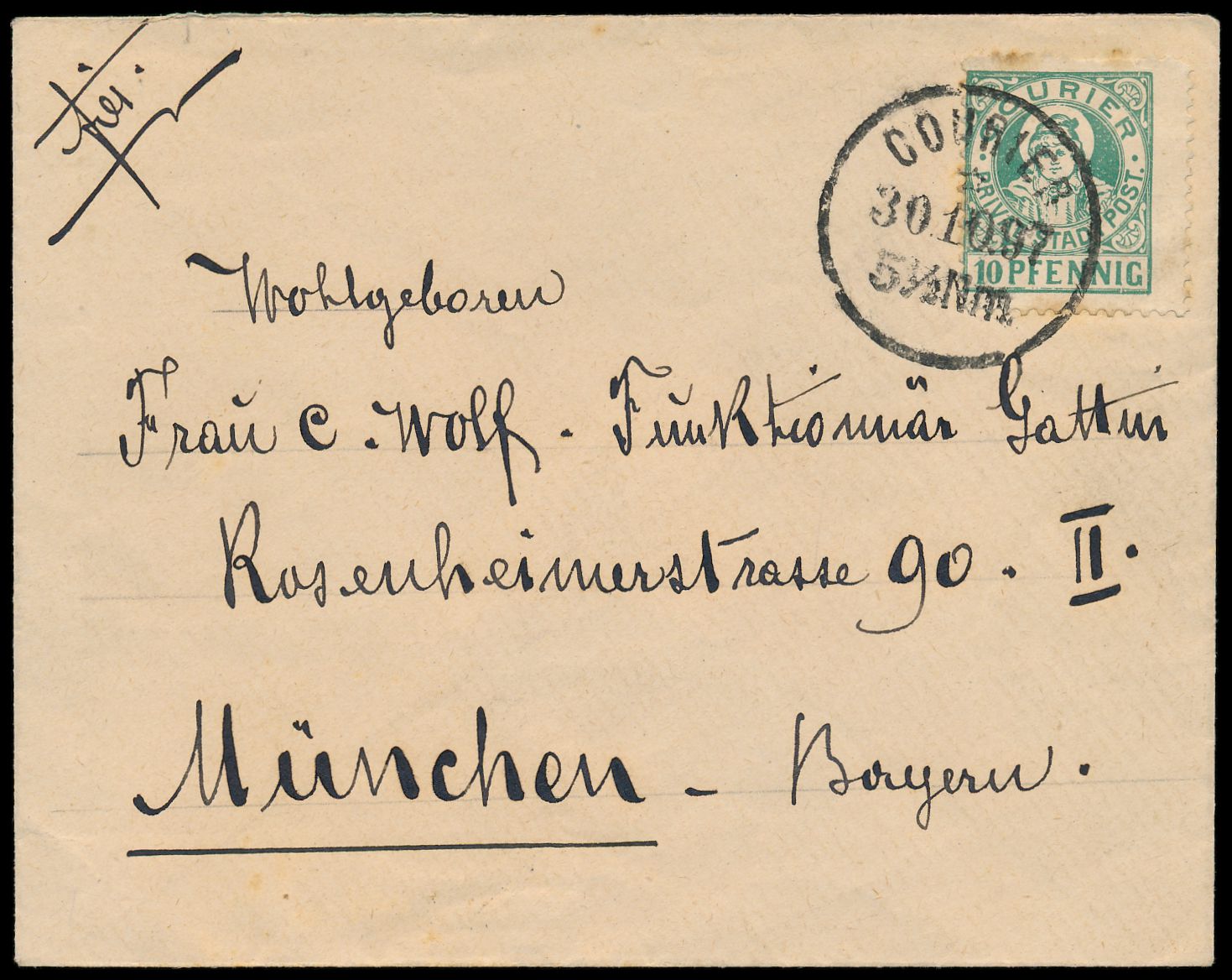 München, Courier-Marke 10 Pf. grün (gering fleckig) als Einzelfrankatur auf Brief mit Stempel Courier 30.10.97, auf Brief sehr selten, Bedarf, MiPr. 1800 DM (1999)