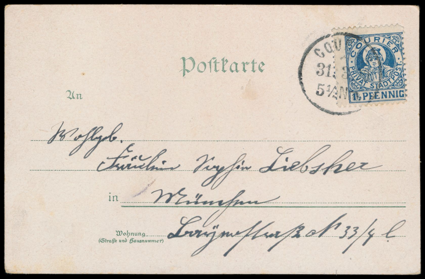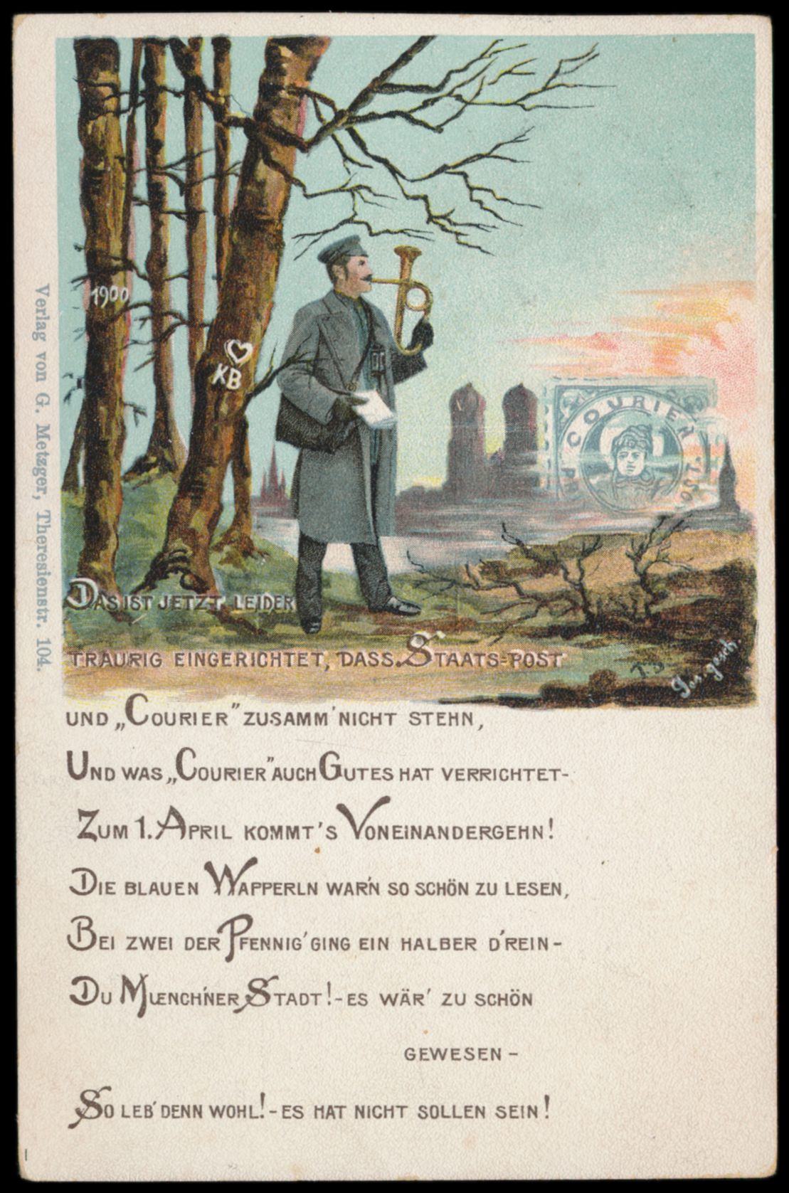 München, Courier-Marke 1 1/2 Pf. auf mehrfarbiger Abschieds-Ansichtskarte , Verlag G. Metzger, Müller PF 2, Letzttagsstempel Courier 31.3.00
