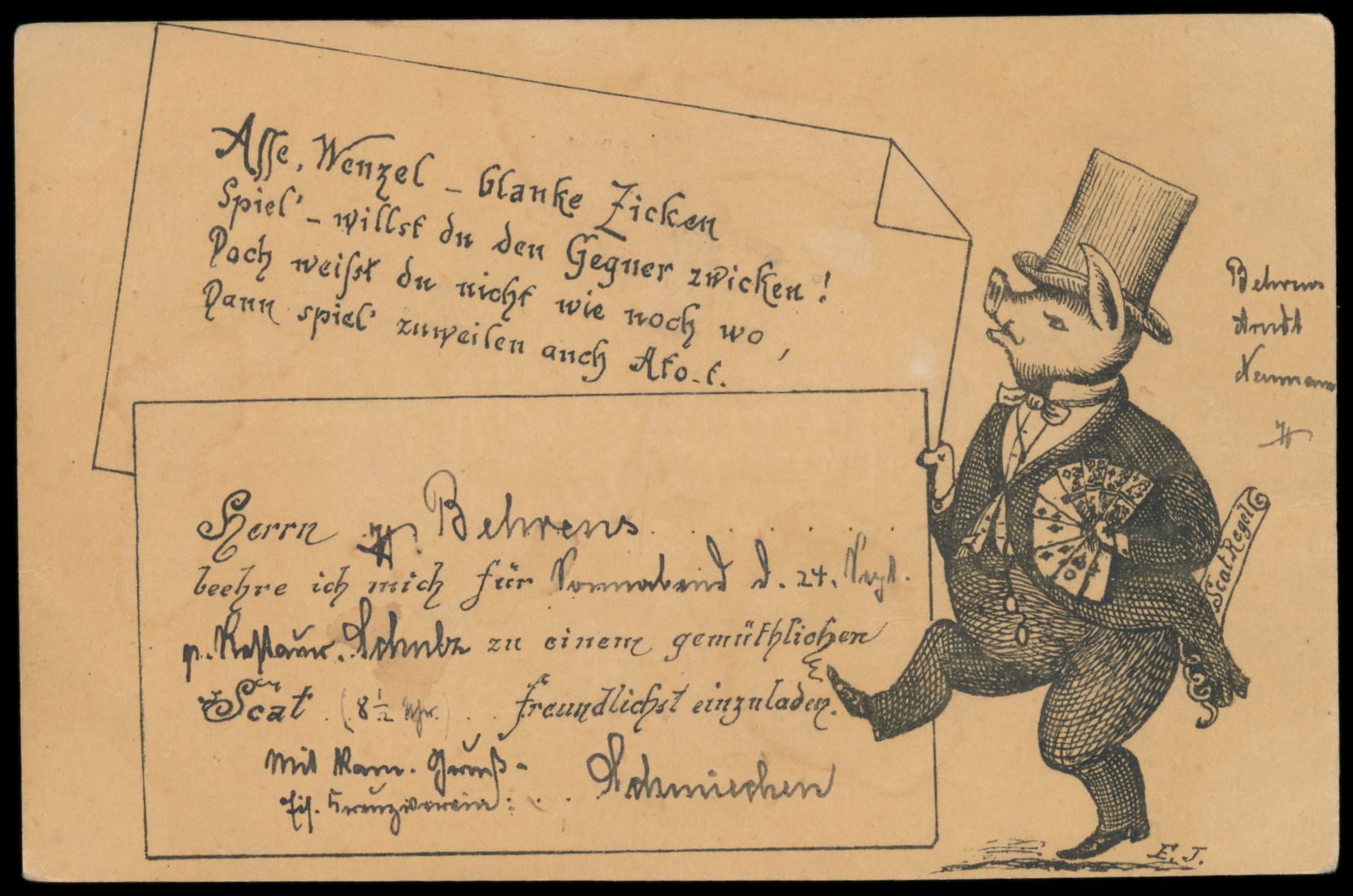 Posen, Hansa-Marke 3 Pf. auf humorvoller Einladungskarte zu einem Skat-Abend, Stempel Hansa Packetfahrt 22.9.93, Bedarf
