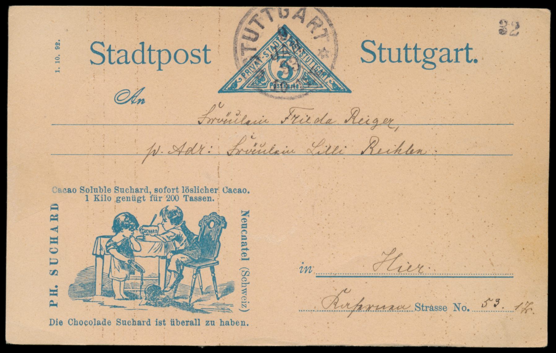 Stuttgart, Privat-Stadtpost, Ganzsache 3 Pf. preußischblau mit Suchard-Reklame "Schokoladentopf gefallen", Horst Müller P 27 IV, Stempel Stuttgart 9.1.93, Bedarf