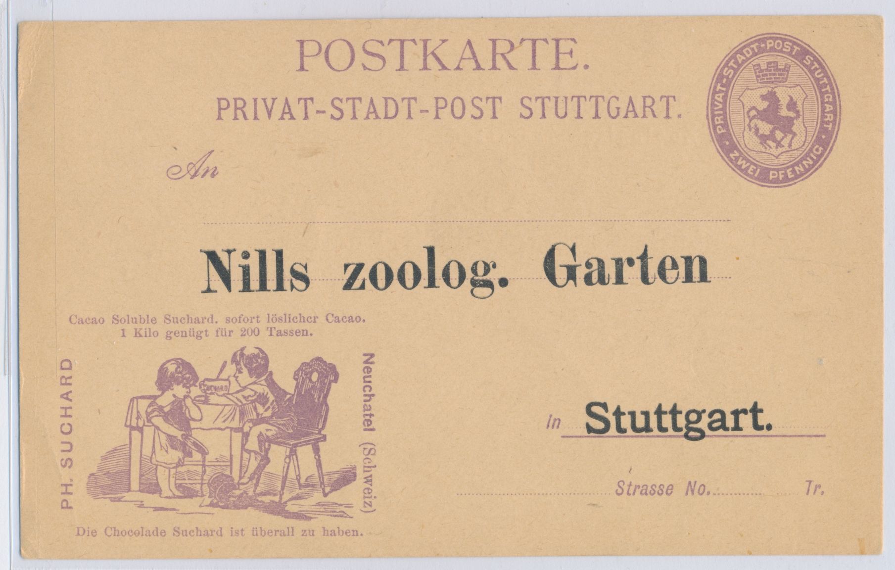 Stuttgart, Privat-Stadtpost, Ganzsache 2 Pf. lila mit Suchard-Reklame (Bild Schokoladentopf gefallen) mit Textzudruck "Nils zoolog. Garten ...", Müller P 67 IV / Z, ungebraucht