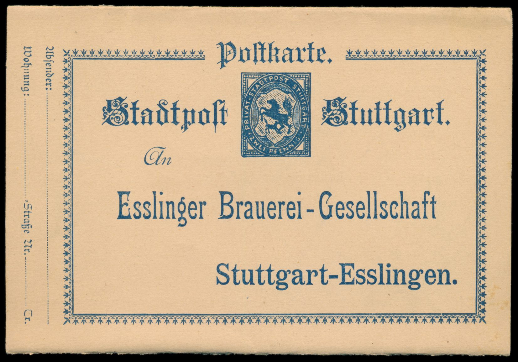 Stuttgart, Privat-Stadtpost, Privatganzsache 2 Pf. blau der Esslinger Brauerei-Gesellschaft, Müller PP 29, kompletter Viererstreifen, ungebraucht, eine Karte kleiner Tintenfleck