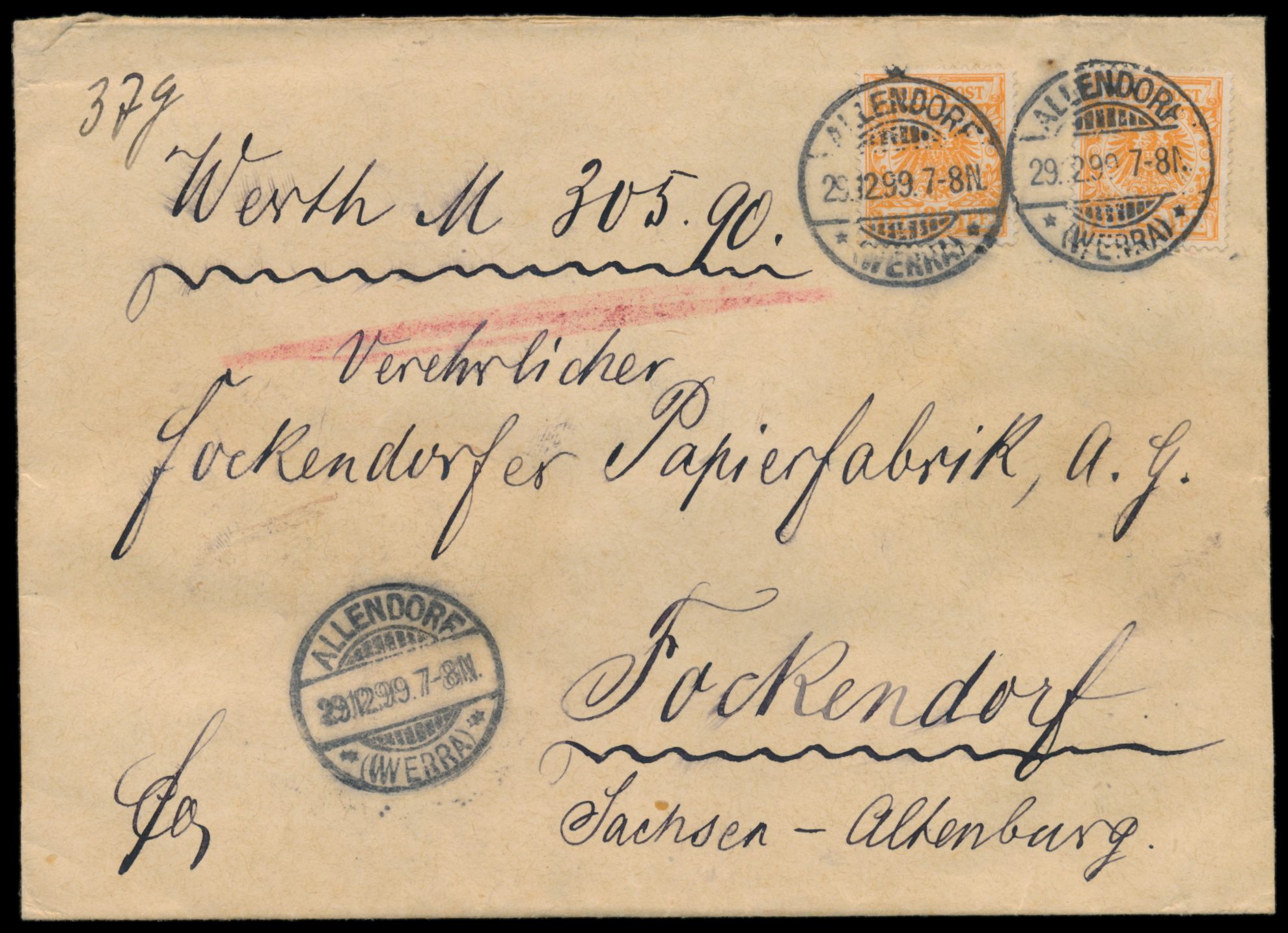 2 x 25 Pf. Krone-Adler auf Wertbrief (Wertangabe 305 Mark), Stempel Allendorf (Werra) 29.12.99, nach Fockendorf, Ankunftstempel 31.12.99, Bedarf