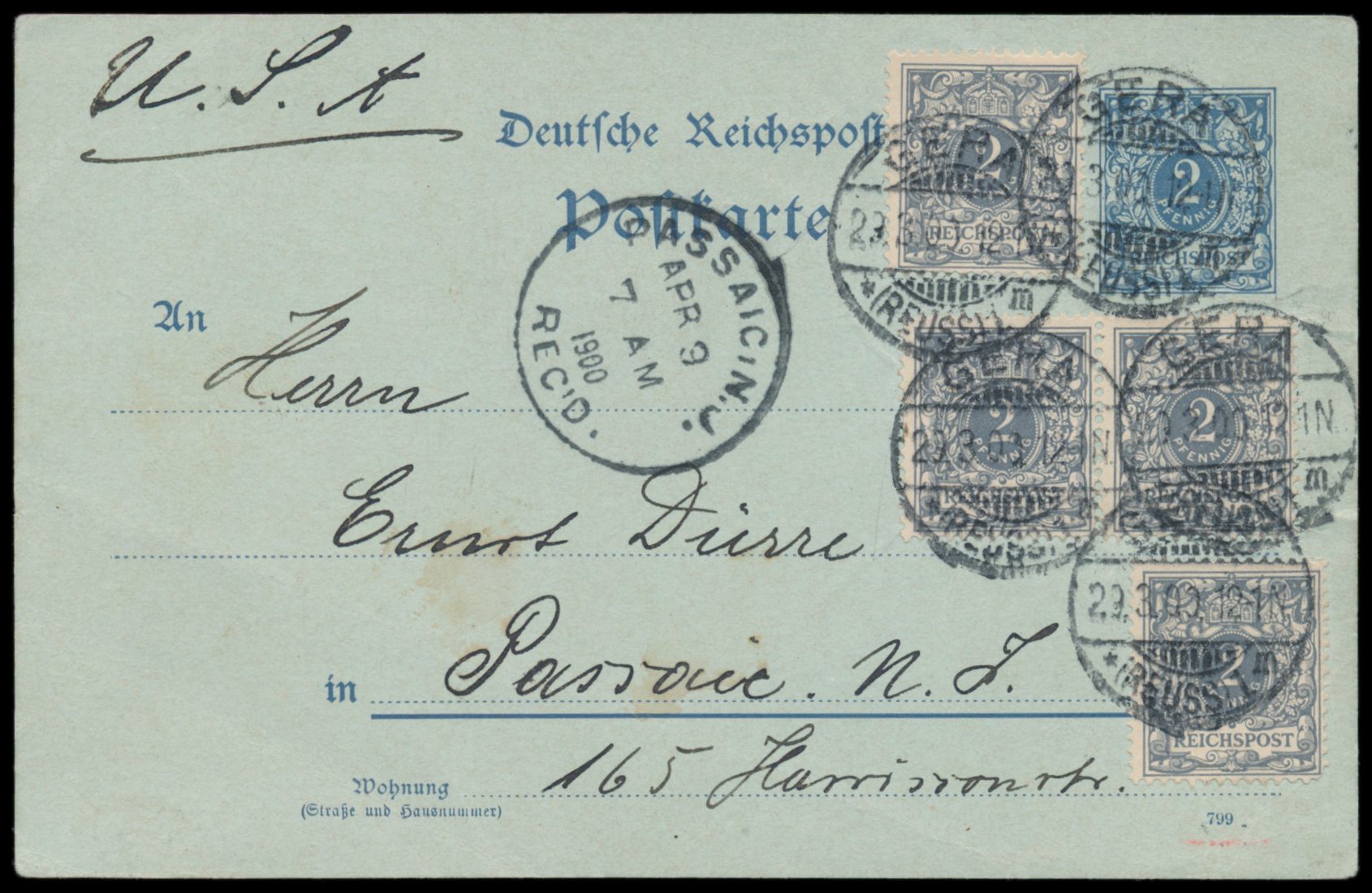 Ganzsache 2 Pf. mit Zusatzfrankatur 4 x 2 Pf. als Auslandskarte mit Stempel Gera 29.3.00 nach USA, Ausgabetag der 2 Pf.-Marke (FDC) und Vorersttag der Ganzsache (laut Michel-Katalog erst am 1.4.1900), Ankunftstempel Passaic 9.4.00, Bedarf