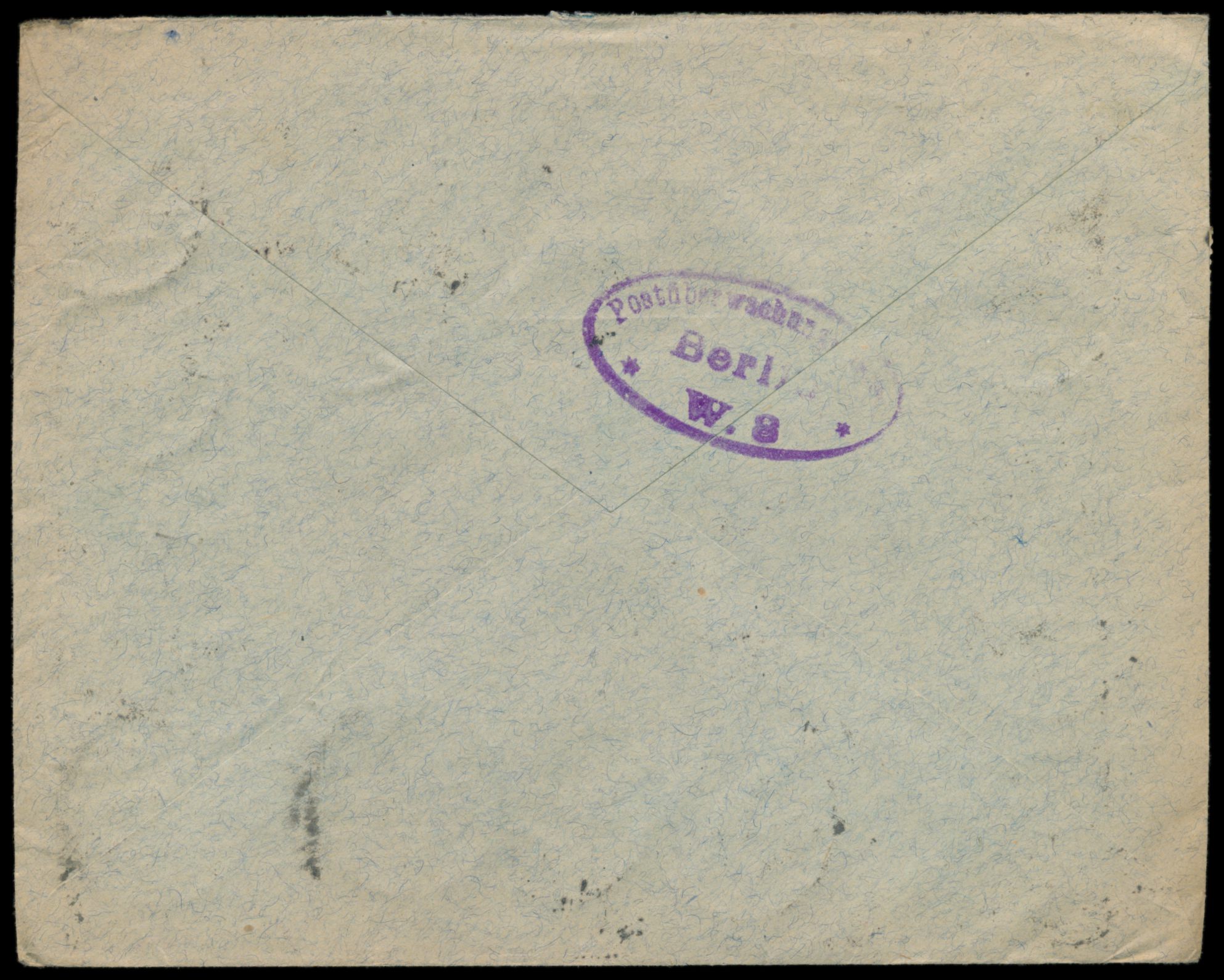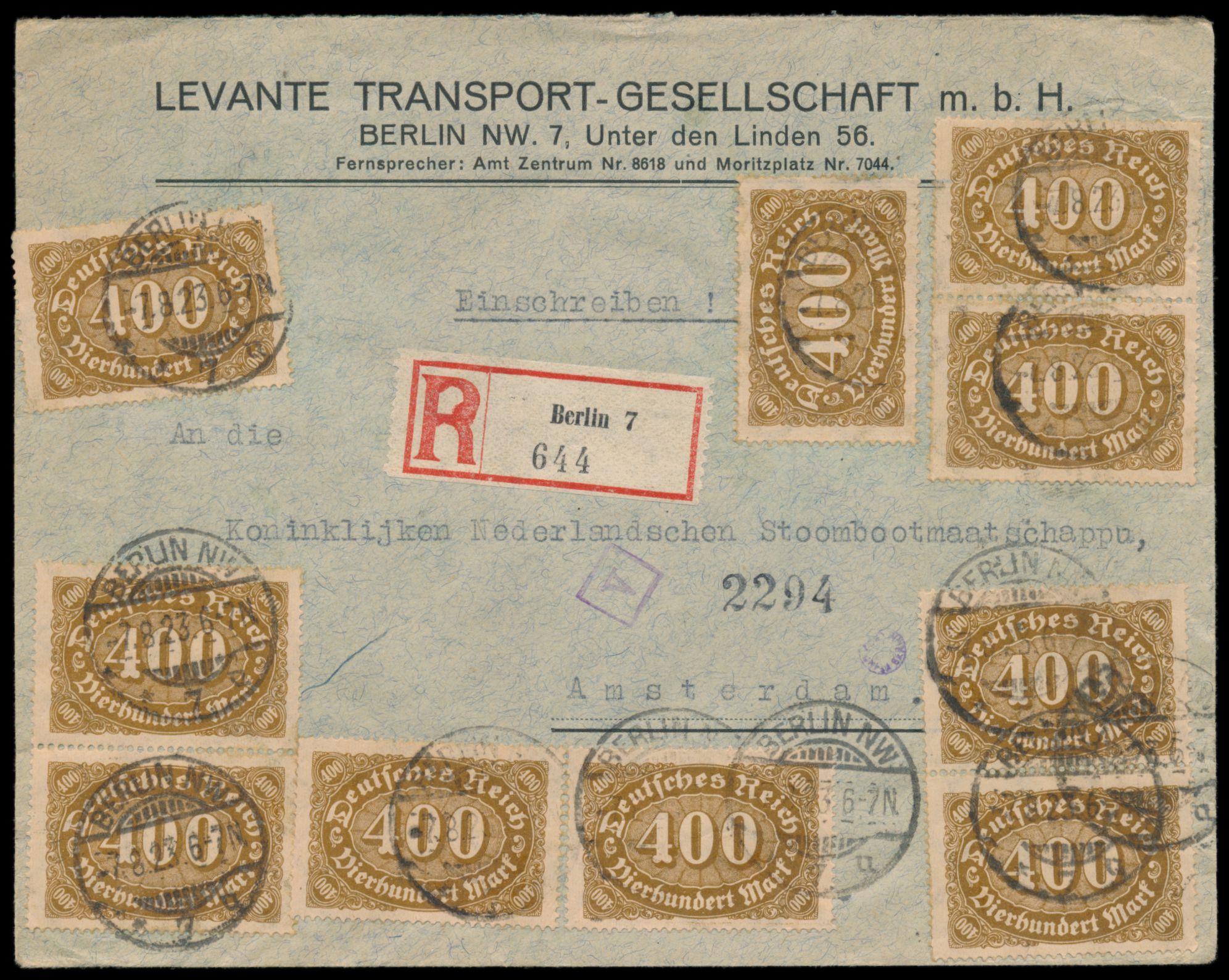 10 x 400 Mark auf Auslands-R-Brief mit Stempel Berlin NW 7 7.8.23 nach Amsterdam, rückseitig Ovalstempel "Postüberwachungsstelle Berlin W. 8", portorichtig, Bedarf