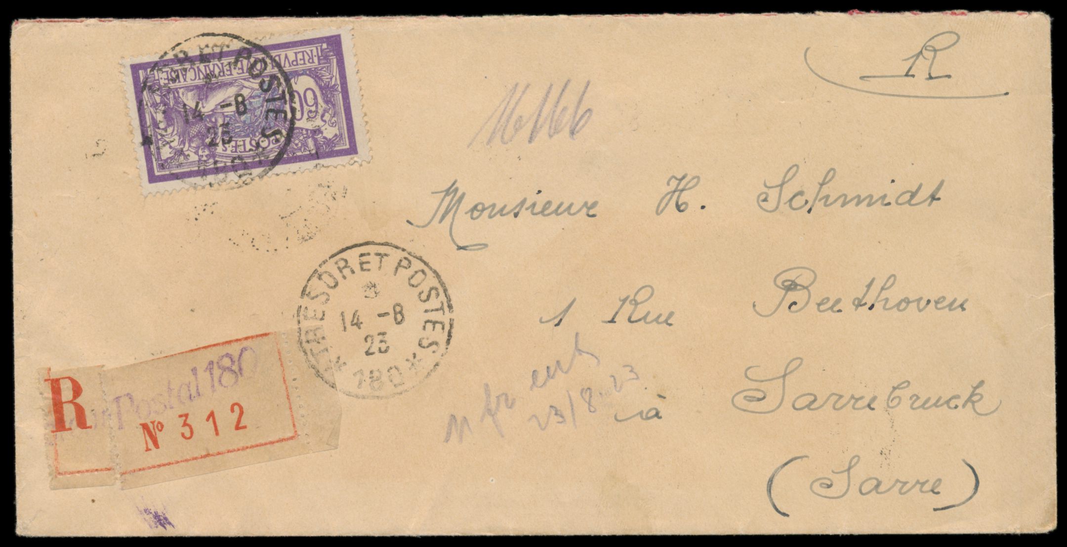 Rheinland-Besetzung, Frankreich 60 C. auf Einschreibbrief mit Stempel Tresor et Postes 180 14.8.23 (Biebrich) nach Saarbrücken, Ankunftstempel Saarbrücken 3 (St. Johann) 15.8.23, Bedarf