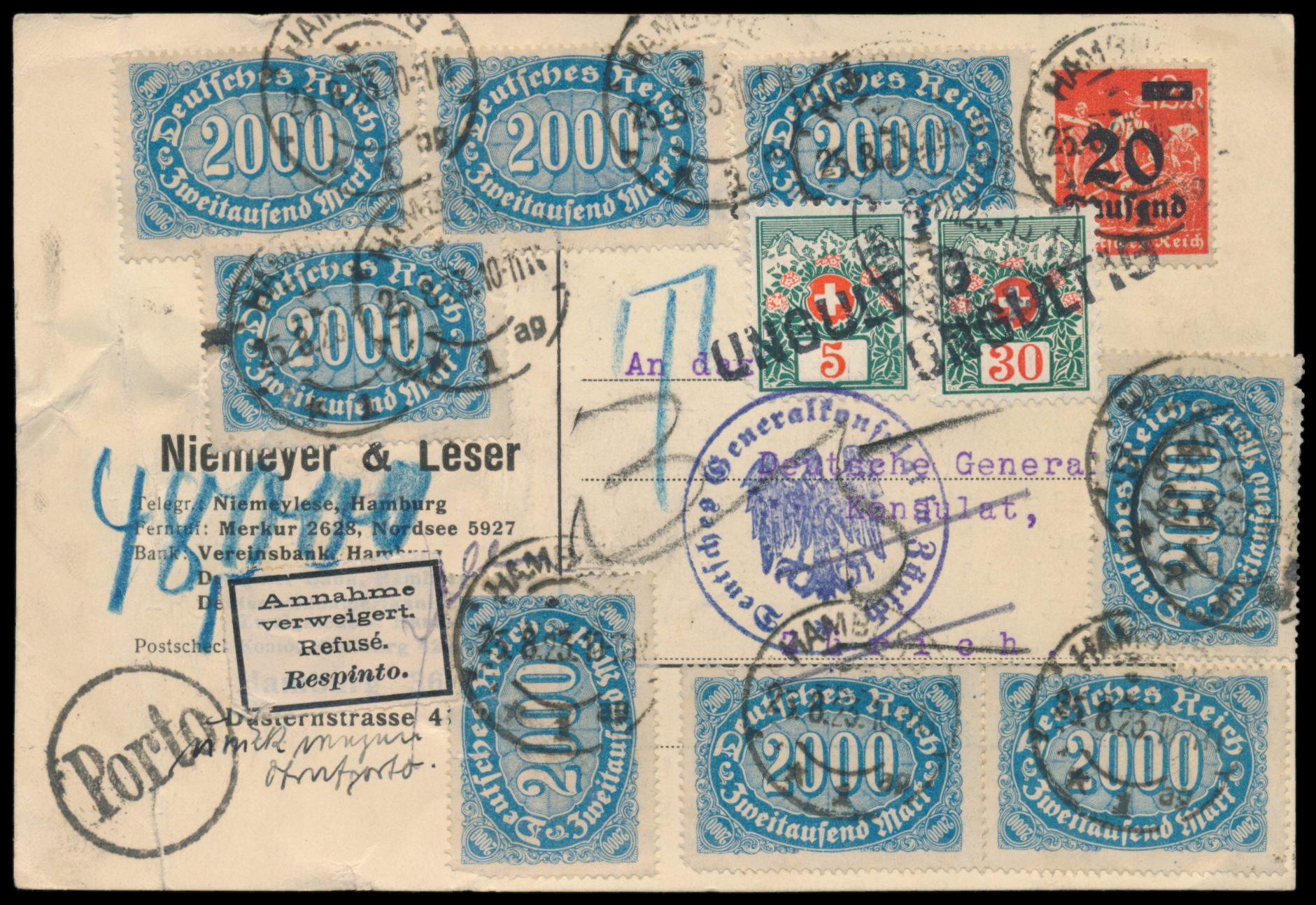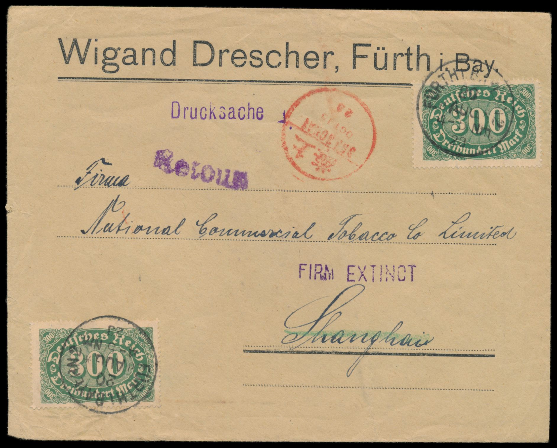2 x 300 M. auf Auslandsdrucksache mit Stempel Fürth i. Bayern 2 20.8.23 nach China, roter Ankunftstempel Shanghai 15.10.23, violetter L1 Retour und Firm Extinct, portorichtig, Bedarf