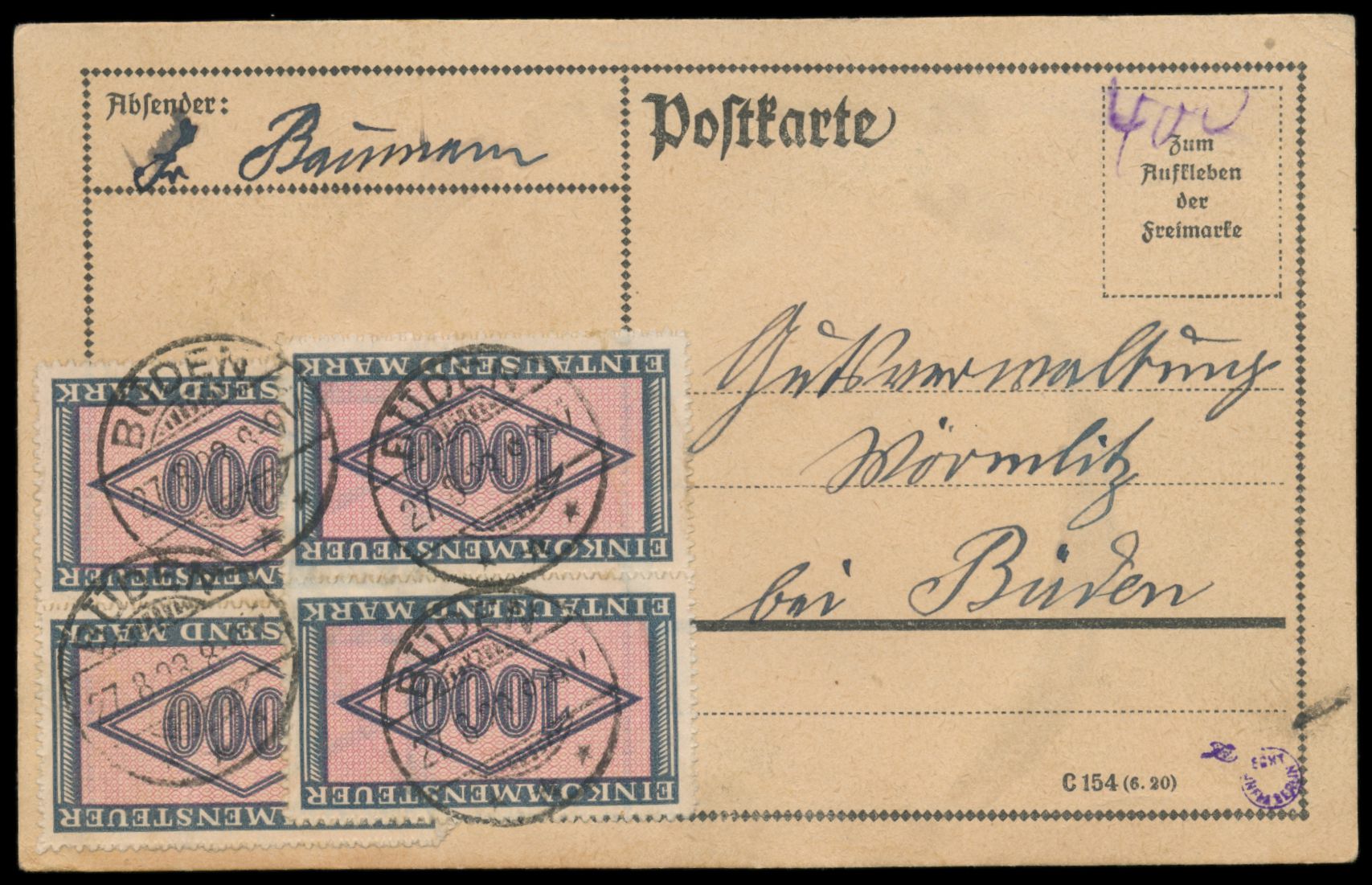 4 x Einkommensteuer-Marke 1000 Mark auf Ortskarte mit Stempel Büden 27.8.23, portorichtig, Bedarf