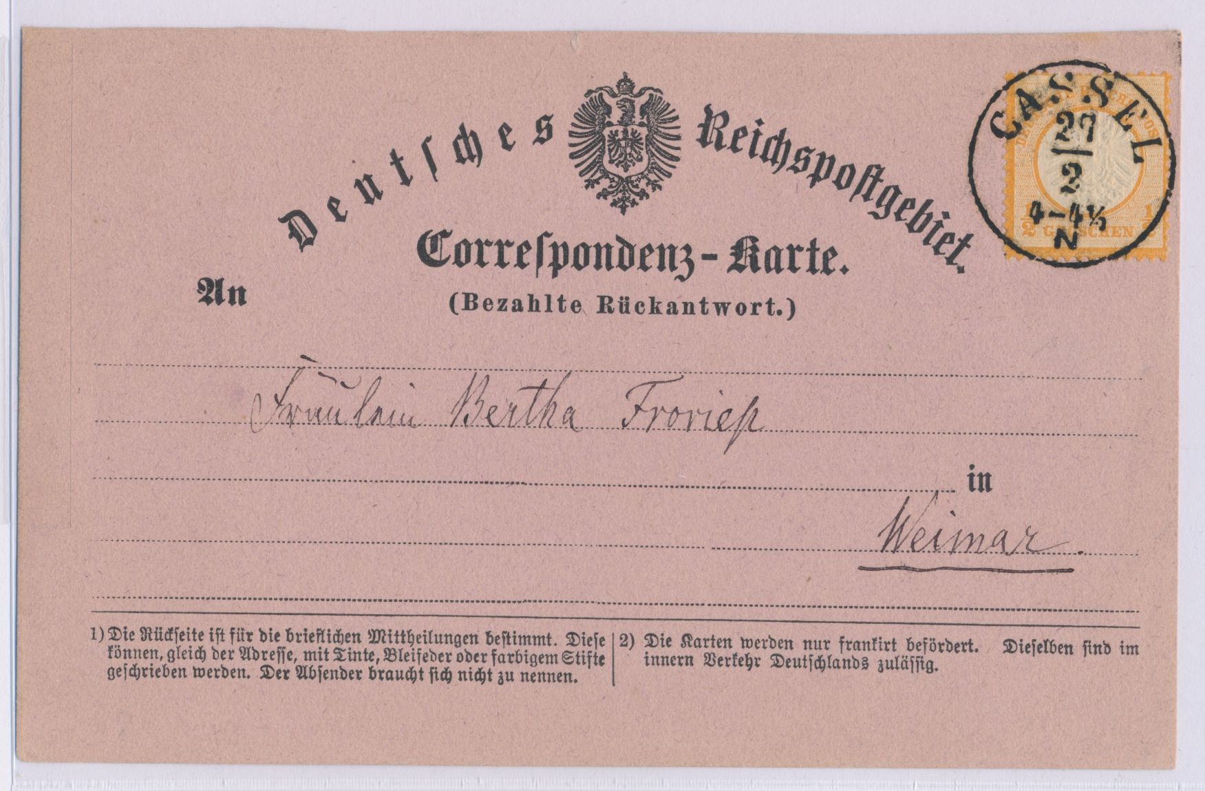 1/2 Gr. auf lila Antwortkartenformular "Deutsches Reichspostgebiet ... (Bezahlte Rückantwort)" der OPD Frankfurt / Main, Thurn & Taxis-K1 Cassel 27.2.(1874) nach Weimar