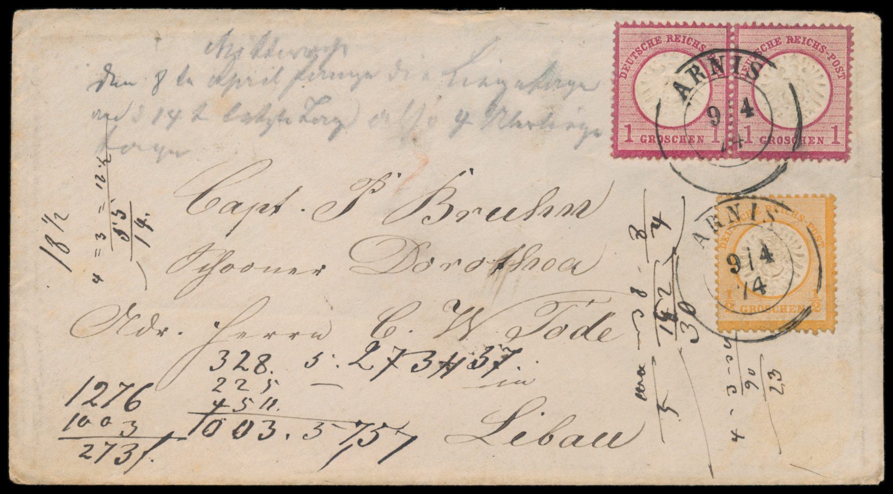 1/2 Gr. und Paar 1 Gr. auf Brief nach Libau / Russland, weiterverwendeter Schleswig-Holstein-K2 Arnis 9.4.74, Ankunftsstempel Libau 31.3.74, Umschlag mit Notizen