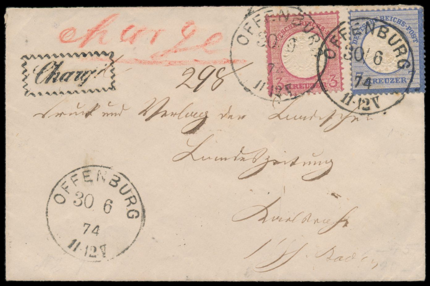 3 und 7 Kr. Großer Schild auf Einschreibbrief, R1 Chargé Zackenrand, K1 Offenburg 30.6.74, Ausgabestempel Karlsruhe, 3 Kr. kleine Marke L 15, 7 Kr. durch Randklebung etwas bestoßen, Foto-Befund Hennies
