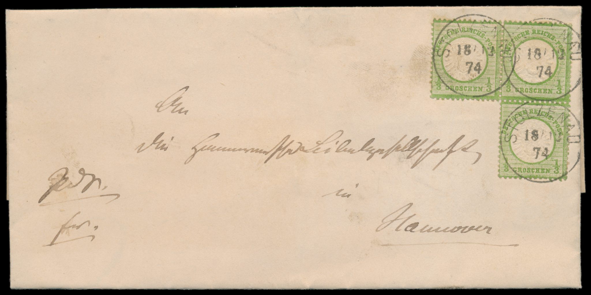 3 x 1/3 Gr. zusammenhängend als Block auf Faltbriefhülle, Stempel Stolzenau 18.12.74, nach Hannover, Ankunftstempel vom gleichen Tag
