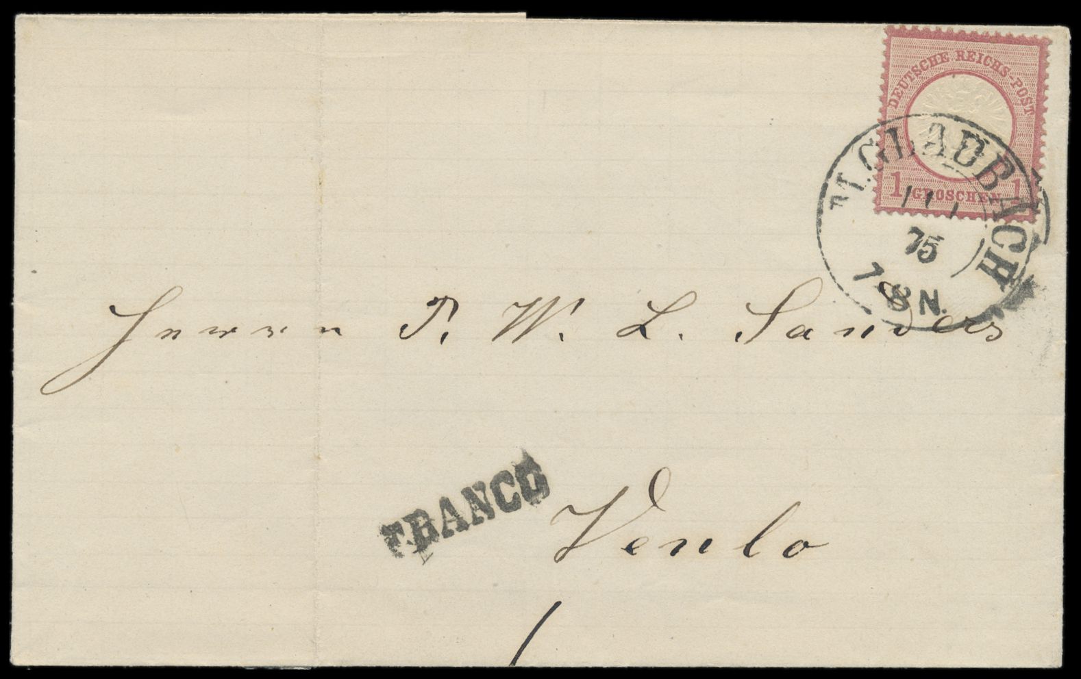 1 Gr. Großer Schild auf Briefhülle M. Gladbach 11.1.75 nach Venlo, Z1 Franco, als 10 Pfg. verwendet im Grenzrayon nach den Niederlanden ungewöhnlich, Ankunftsstempel 14.1.75