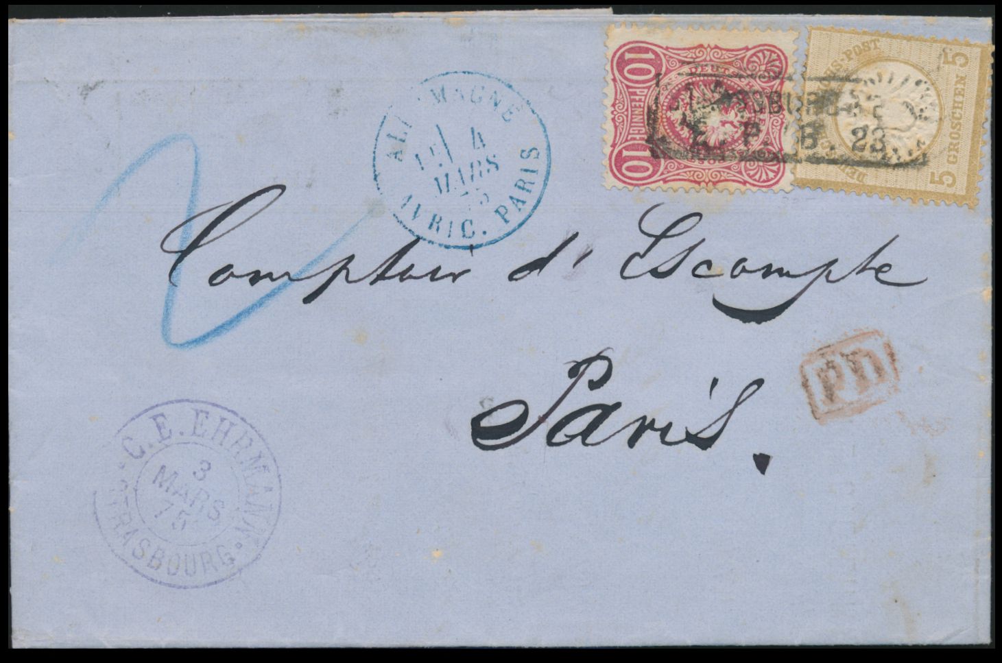 Währungs-Mischfrankatur 5 Gr. mit 10 Pfe. auf Faltbrief nach Paris, Rahmenstempel Strassburg E. P. B. 23 ohne Datum, rückseitig Bahnpost-L3 Strassburg i. E. - Avricourt 3.3.(1875), blauer Grenzübergangsstempel 4.3.75, mit komplettem Inhalt, Marken sind etwas fleckig