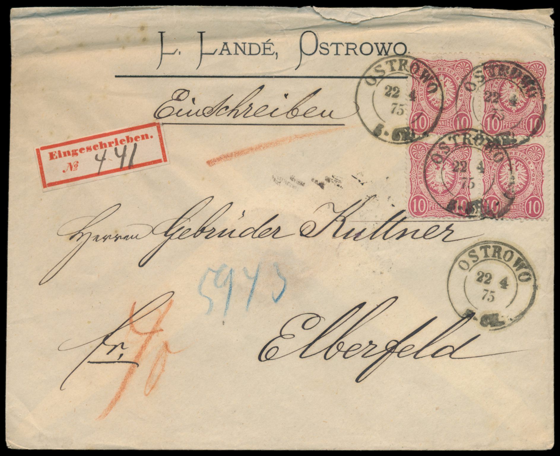 Viererblock 10 Pfe. auf Einschreibbrief 2. Gewicht, Preußen-K2 Ostrowo 22.4.75, 1. R-Zettel "Eingeschrieben No.", nach Elberfeld, Ankunftstempel Elberfeld 24.4.75