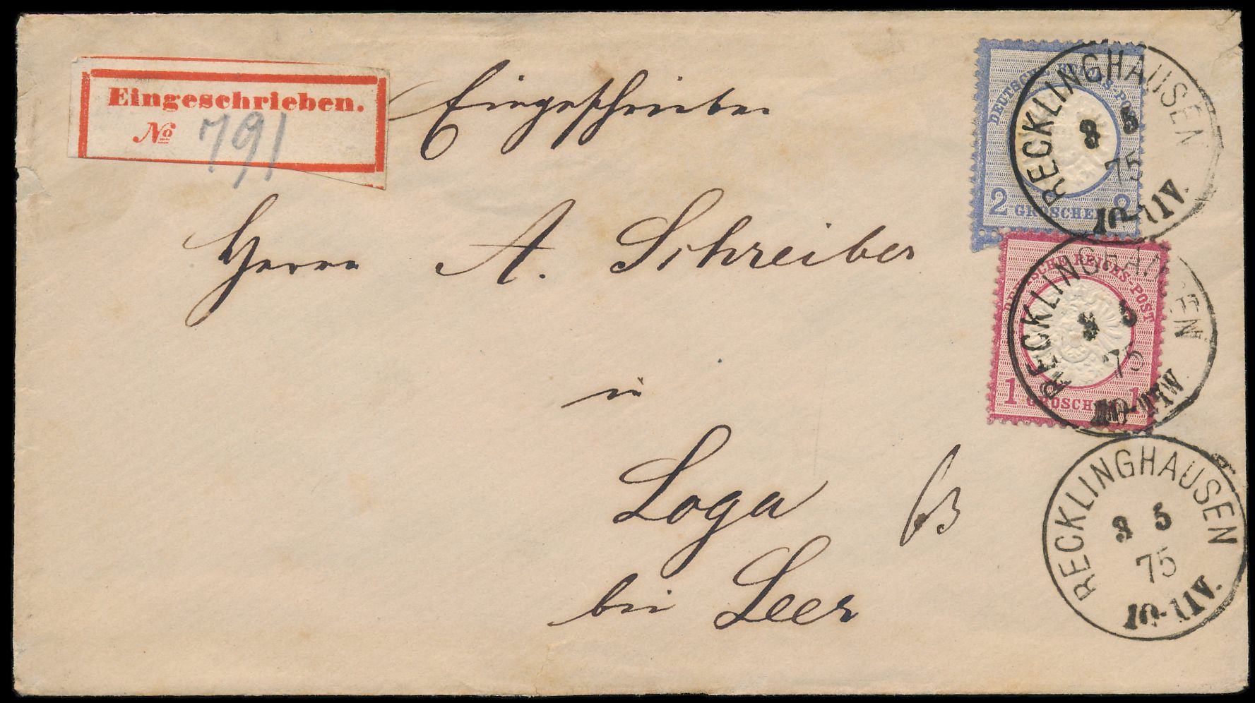 1 Gr. und 2 Gr. (als 30 Pf.) auf Einschreibbrief mit Stempel Recklinghausen 3.5.75 und 1. R-Zettel "Eingeschrieben No. ..." nach Loga bei Leer