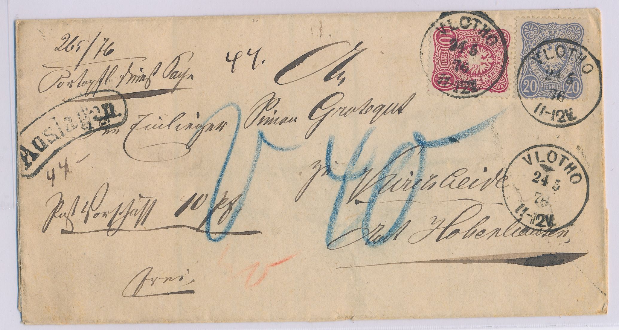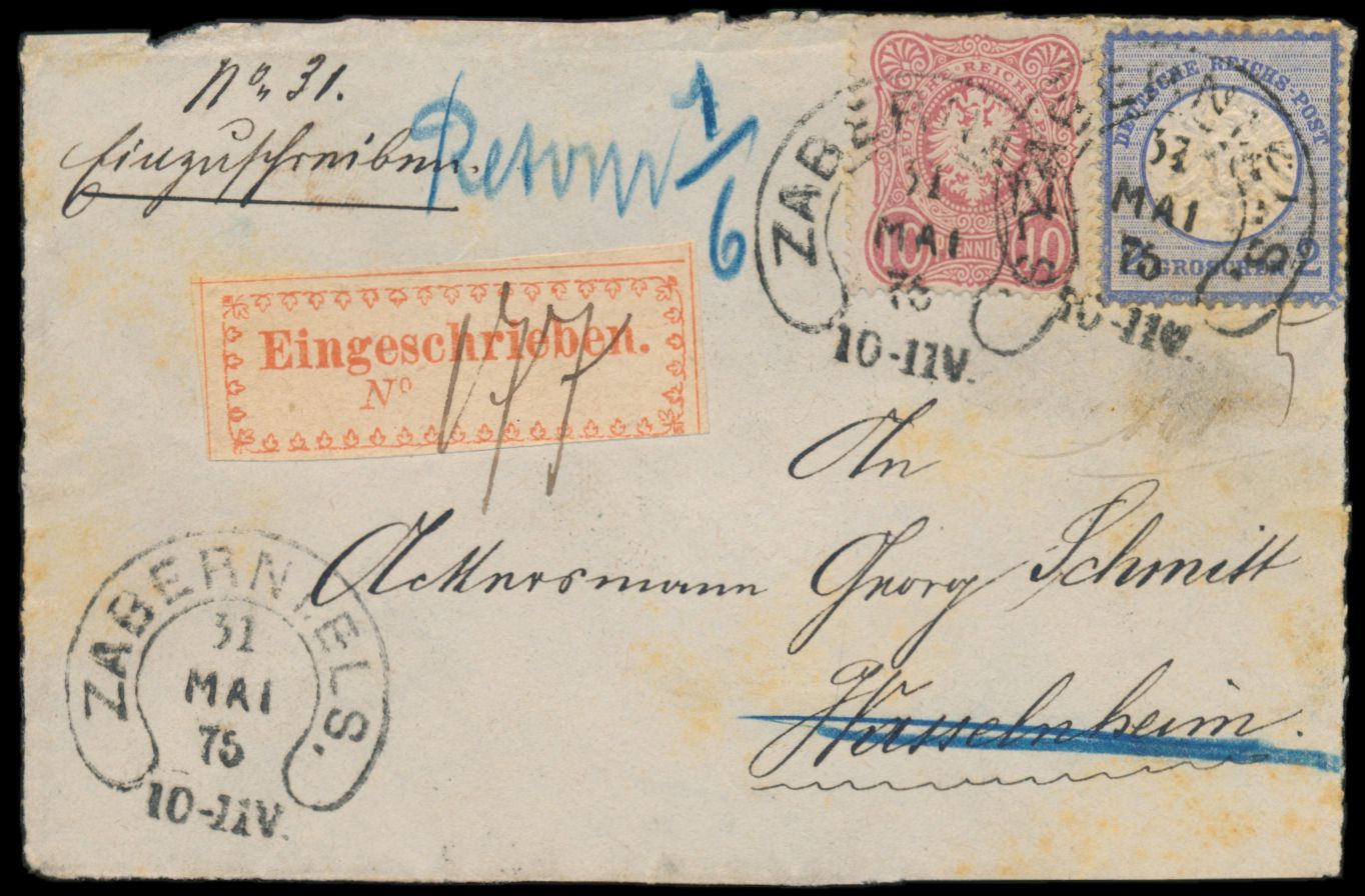 Mischfrankatur 2 Gr. Großer Schild mit 10 Pfge. auf R-Brief-Vorderseite, Hufeisenstempel Zabern i. Els. 31,5.75, Versuchs-R-Zettel " Eingeschrieben" mit Efeublättern