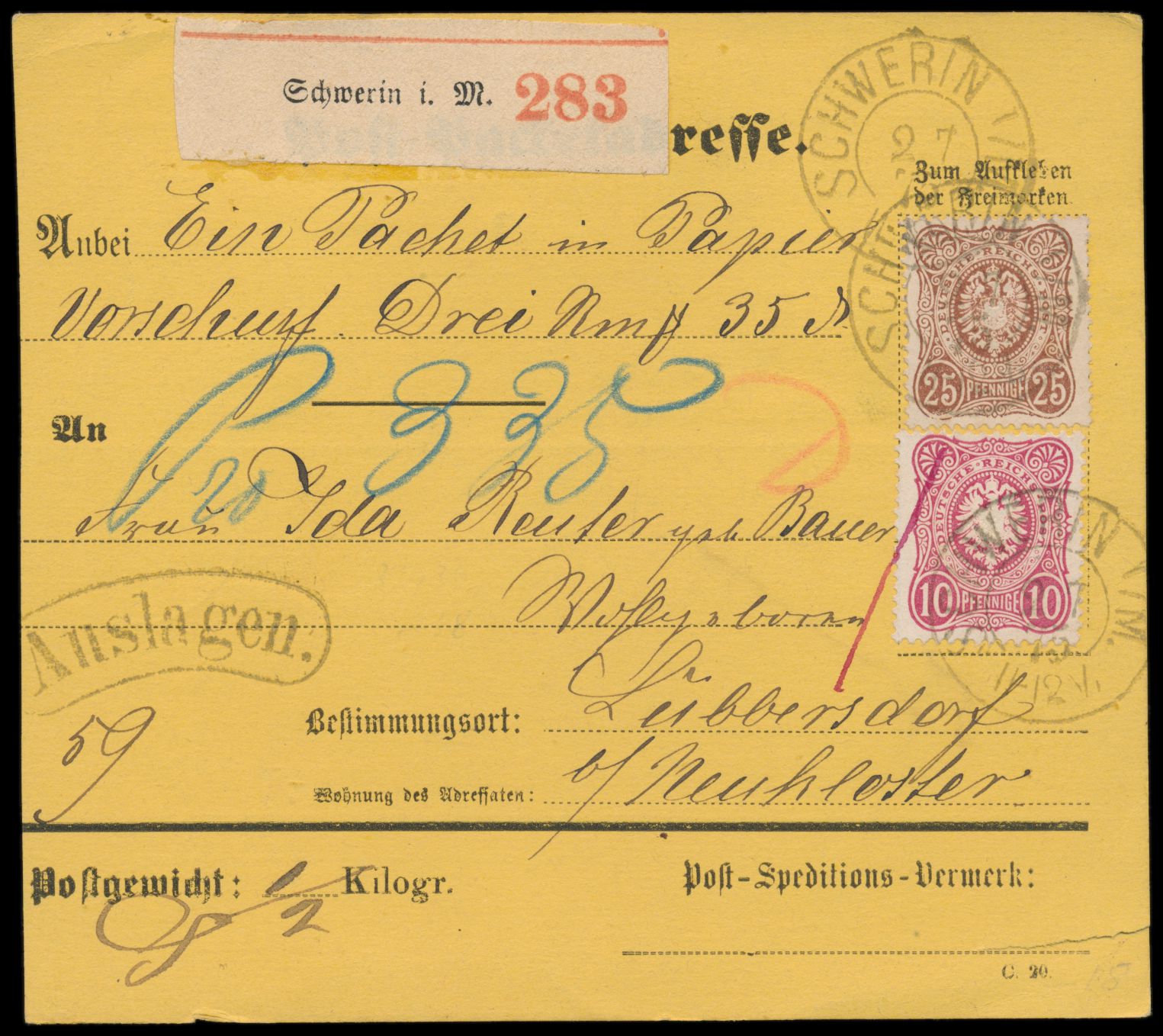 10 Pfe. und 25 Pfe. auf Auslagen-Paketkarte für ein Paket von 1/2 kg Gewicht von Schwerin nach Lübbersdorf bei Neukloster, Zweikreisstempel Schwerin I / M. 2.7.75, Ankunftstempel 2.7.