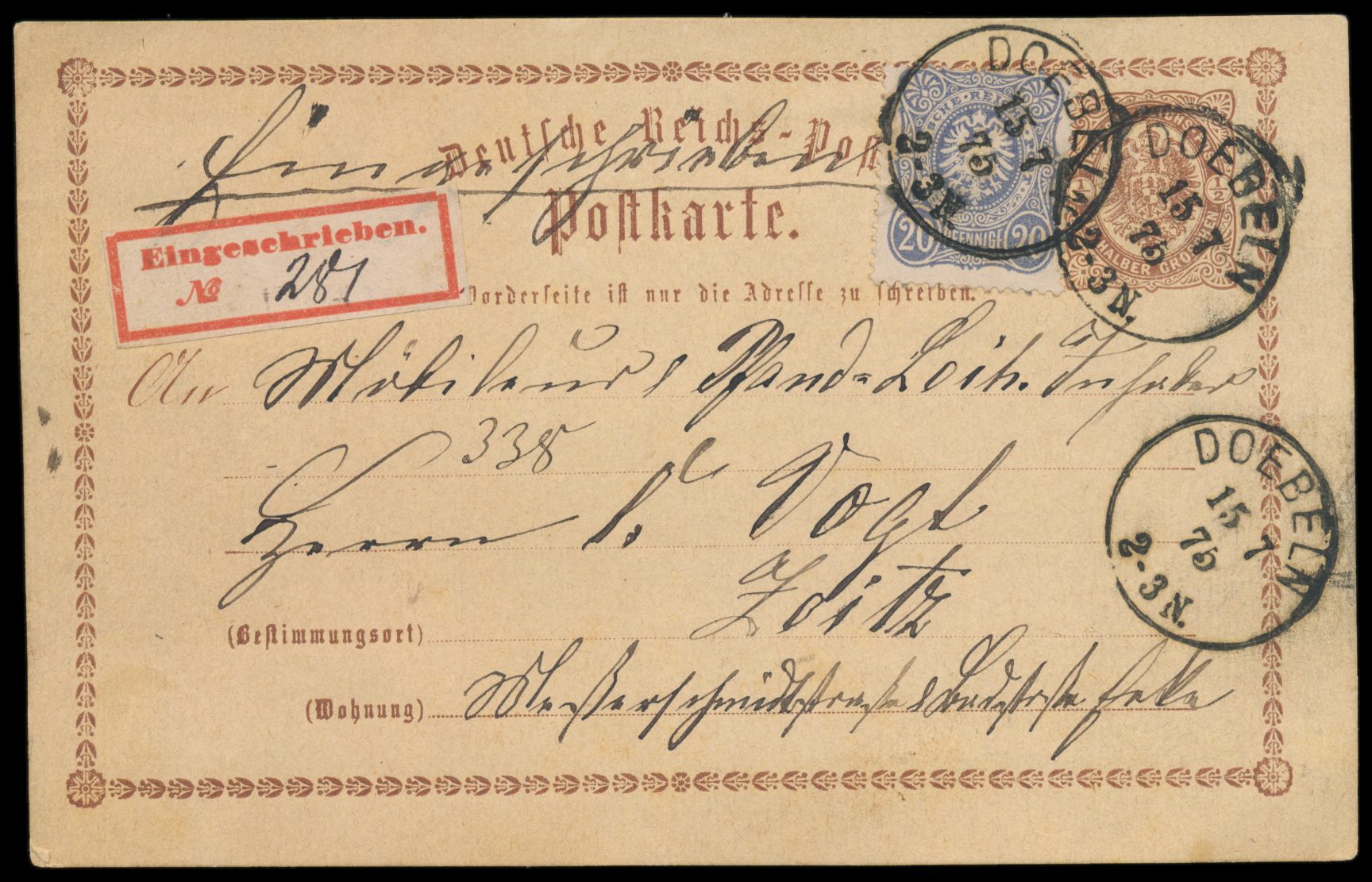 Ganzsache 1/2 Gr. mit Zusatzfrankatur 20 Pfe. als Einschreiben-Postkarte, Stempel Doebeln 15.7.75, R-Zettel "Eingeschrieben", nach Zeitz, sehr seltene Währungs-Mischfrankatur, laut Handbuch von Manfred Wiegand sind nur zwei 1/2 Gr.-Postkarten mit Zusatzfrankatur 2 x 10 Pfe. als Einschreiben bekannt, die Kombination mit 20 Pfe.-Marke ist nur einmal als Auslandsverwendung nach Schweden registriert, Handbuch LP