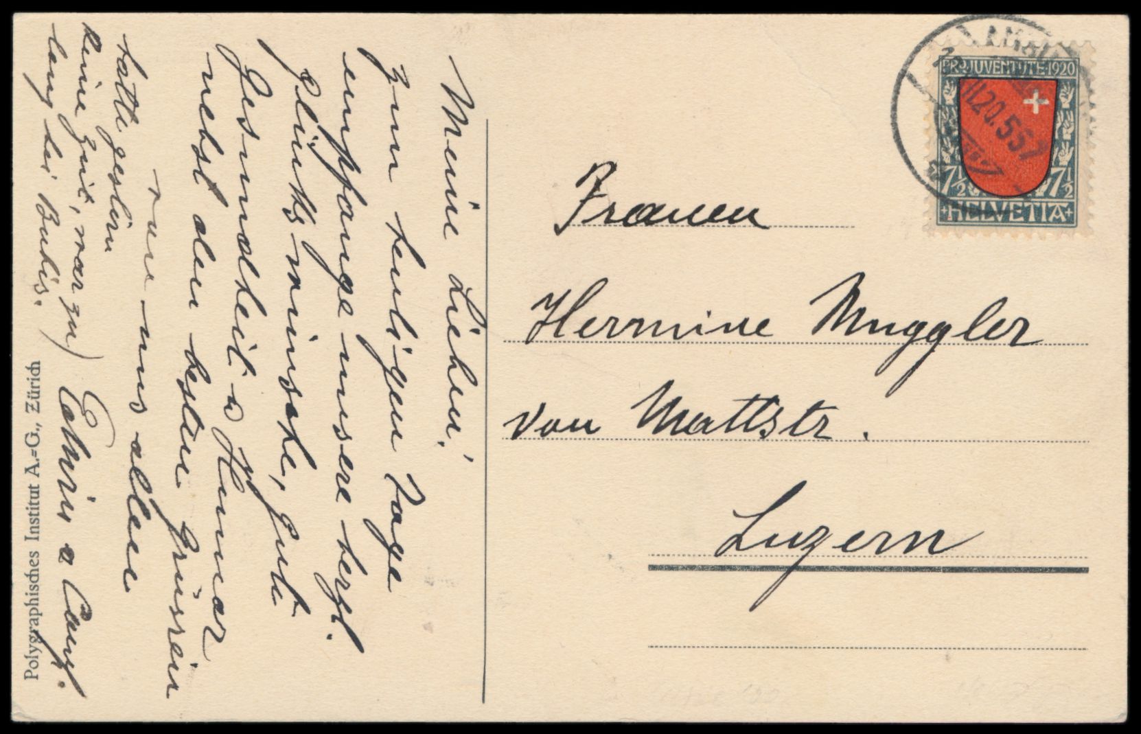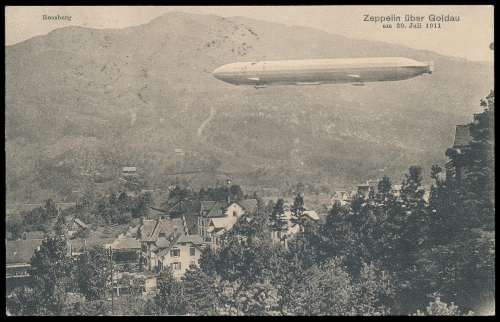 schweizer Ansichtskarte Zeppelin über Goldau 20.7.1911, (LZ 10 Schwaben), mit 7 1/2 Ct. Pro Juventute, Stempel Aarau 10.12.20, Bedarf nach Luzern