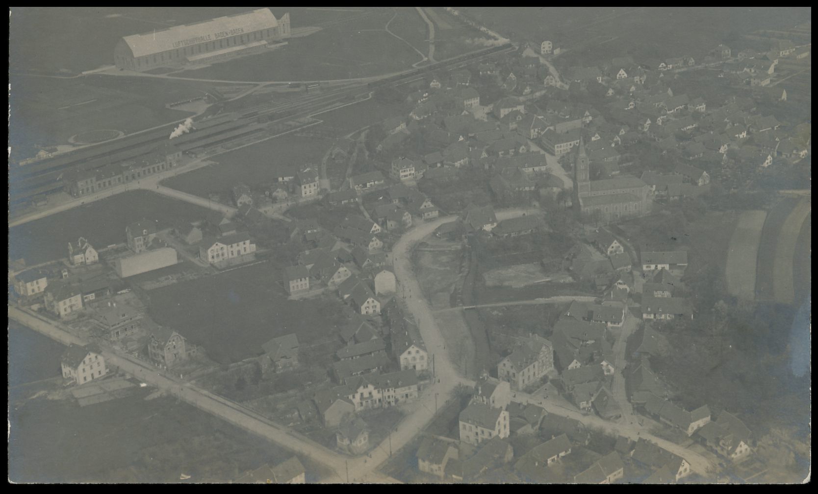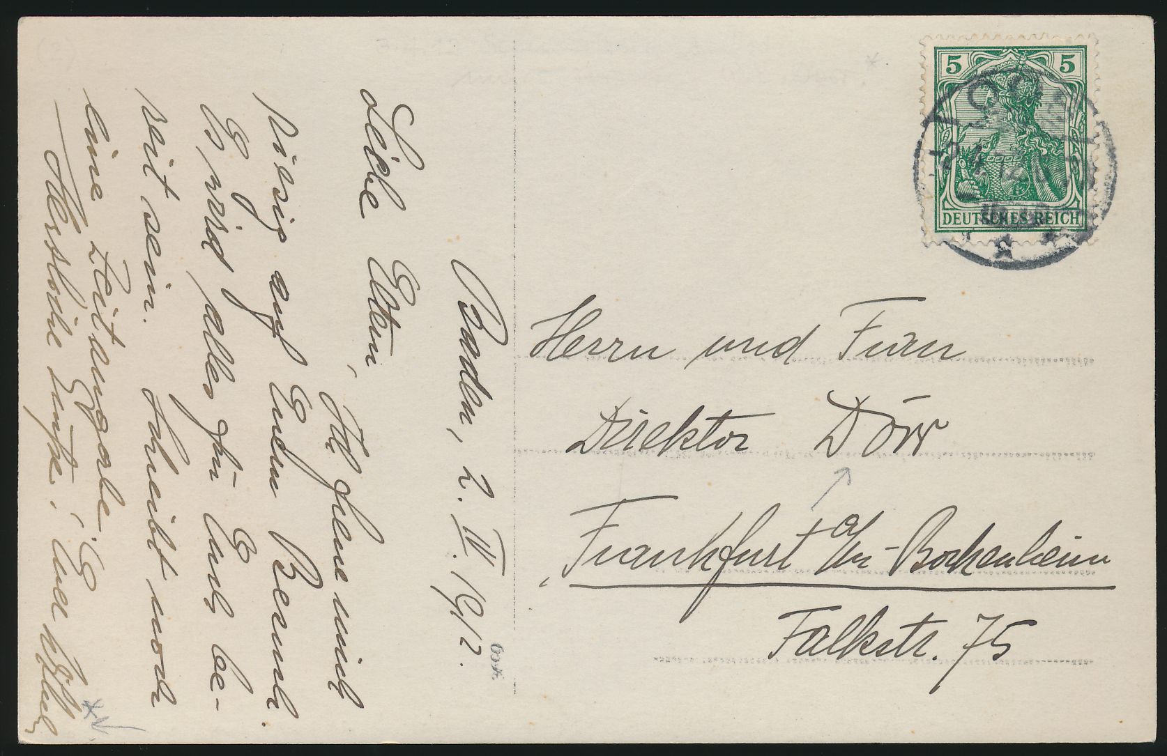 Luftschiffaufnahme von Baden-Baden (mit Luftschiffhalle) mit 5 Pfg. Germania (Eckbug), Stempel Oos 2.4.12, Schreiber der Karte ist der Zeppelin-Führer Wilhelm Dörr, adressiert an seine Eltern in Frankfurt , Bedarf