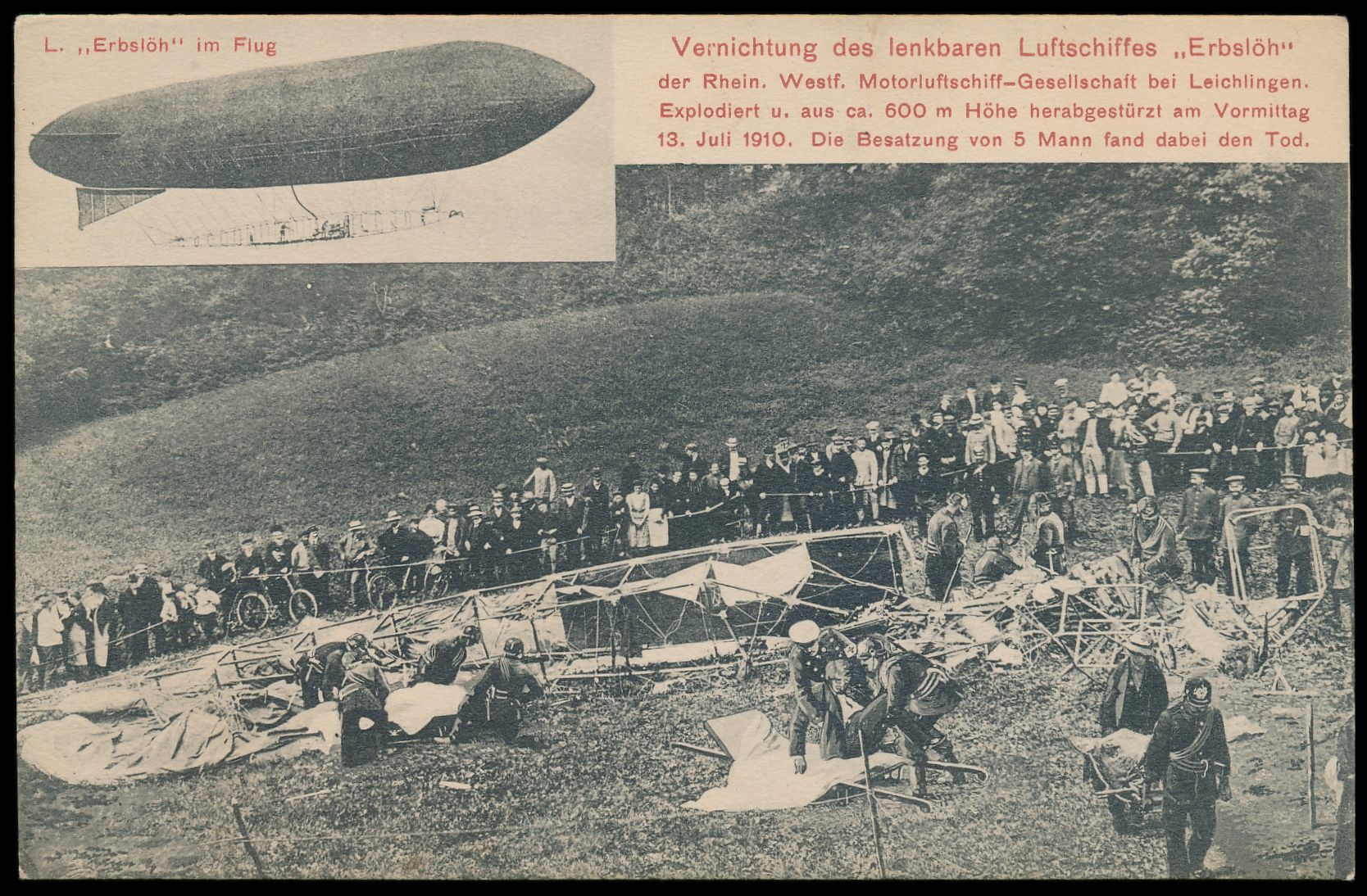 Ansichtskarte des lenkbaren Luftschiffs "Erbslöh" von seiner Absturzstelle bei Leichlingen am 13.7.1910. Oskar Erbslöh baute das Luftschiff mit der RWE-Gesellschaft 1909 bis 1910 für die ILA, nach dem Unglück erfolgte die Einstellung weiterer Versuche, ungebraucht