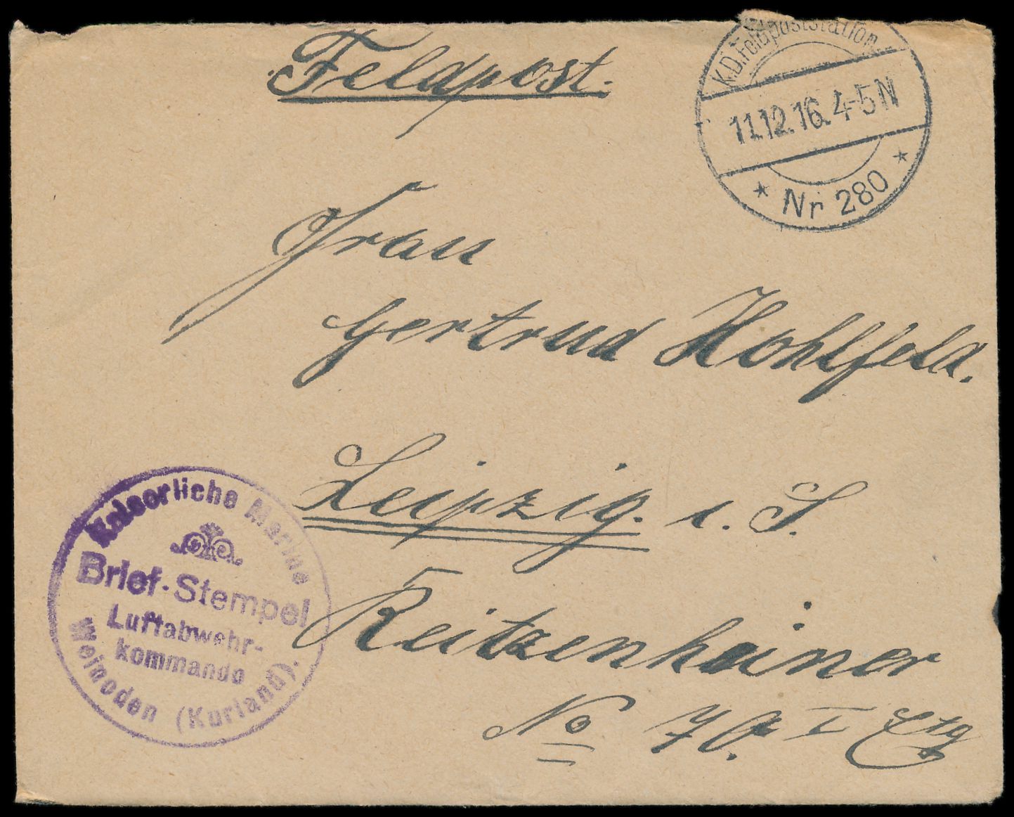 Feldpostbrief mit Stempel K. D. Feldpoststation Nr. 280 11.12.16 und Briefstempel Kaiserliche Marine / Luftabwehr-Kommando Weinoden (Kurland), zum Schutz des Luftschiffhafens Weinoden, nach Leipzig, mit Inhalt
