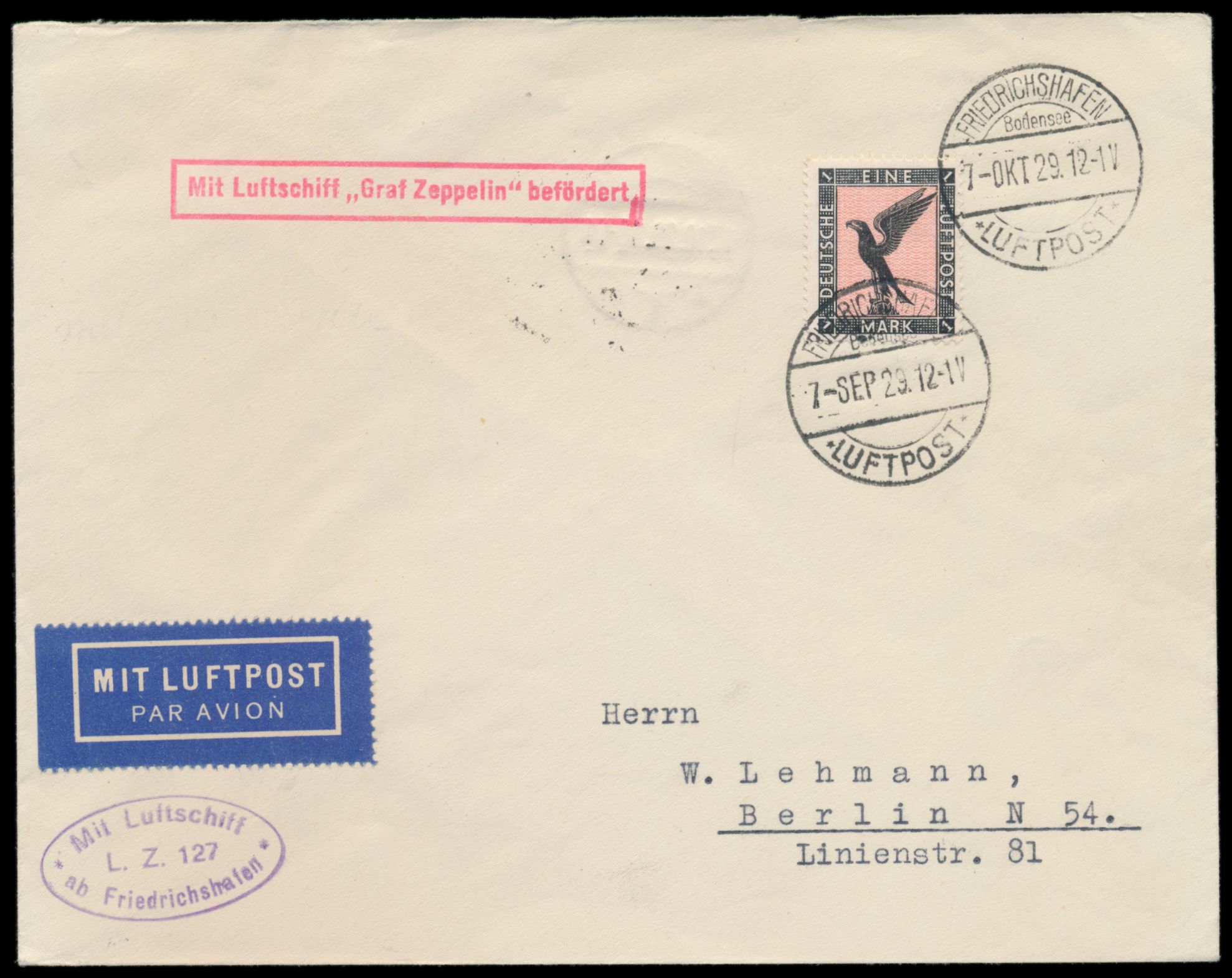 Schlesienfahrt 1929, Auflieferung Friedrichshafen, Brief mit Einzelfrankatur 1 M. Flugpost nach Berlin, Stempel Friedrichshafen Luftpost 7.9.29 , Abwurf Breslau, Durchgangsstempel Breslau 17.10.29