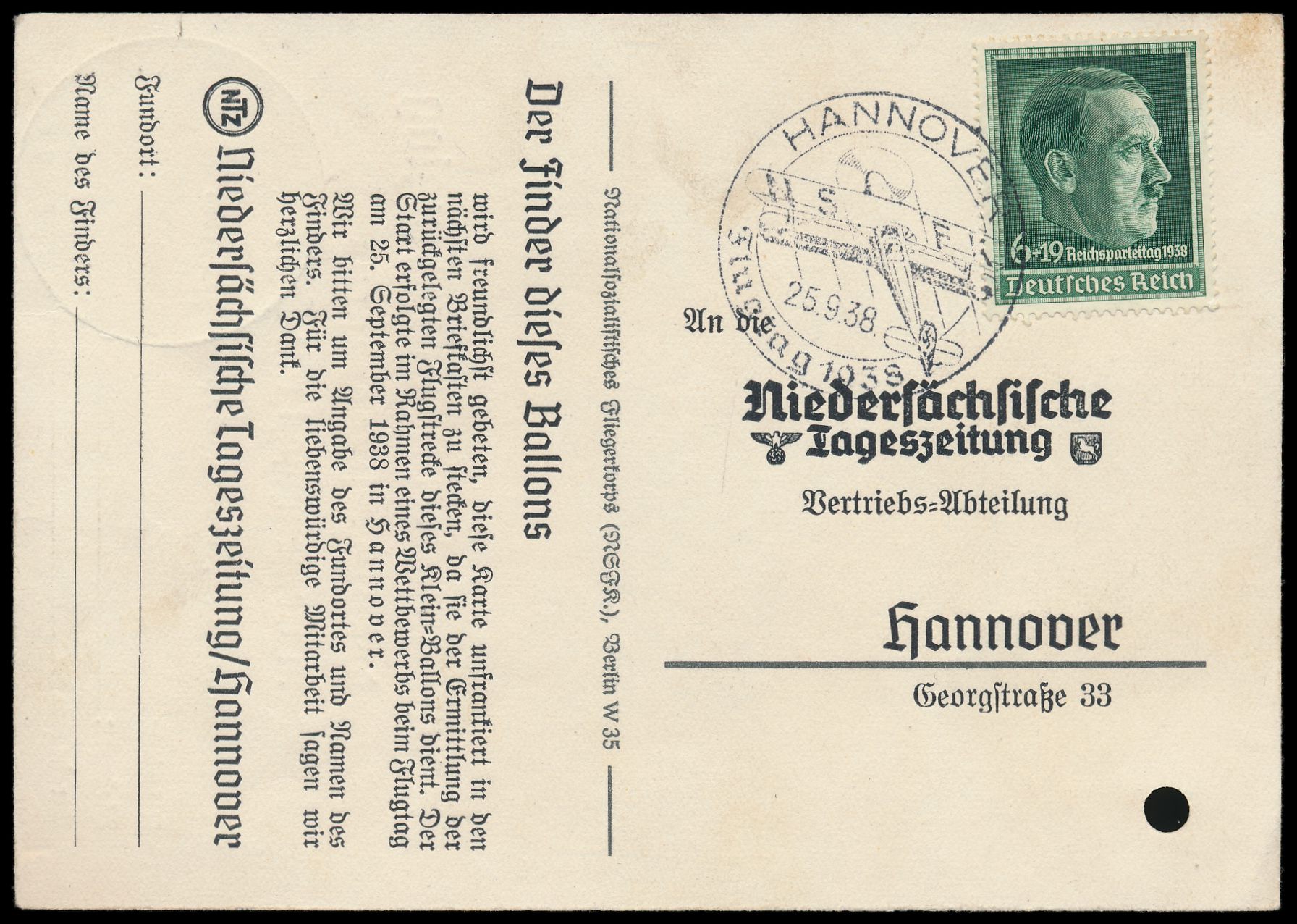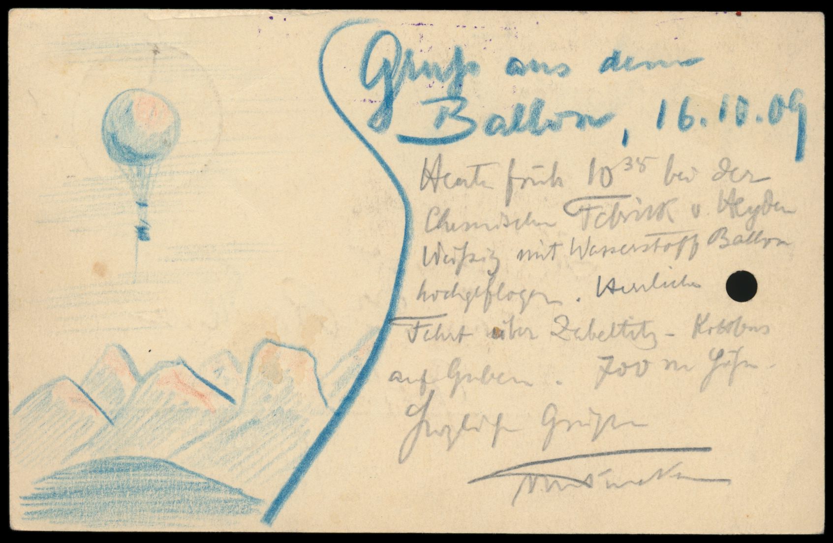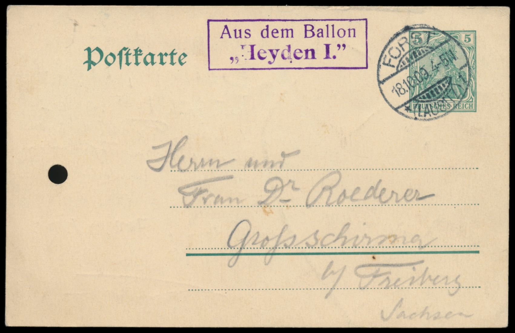 Ganzsache 5 Pf. mit Stempel Forst (Lausitz) 18.10.09 und violettem R2 Aus dem Ballon "Heyden I." , rückseitig Buntstiftzeichnung und Text "Gruß aus dem Ballon, 16.10.09 ... Heute .... bei der Chemischen Fabrik v. Heyden ... mit Wasserstoffballon hochgeflogen ...", seltene Abwurfkarte, links mit Loch zur Befestigung des Gewichts, Bedarf