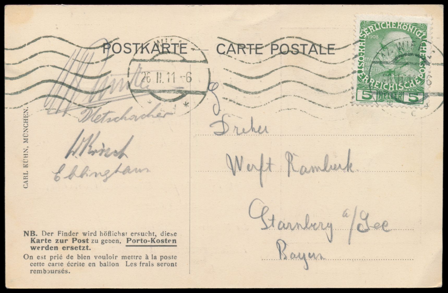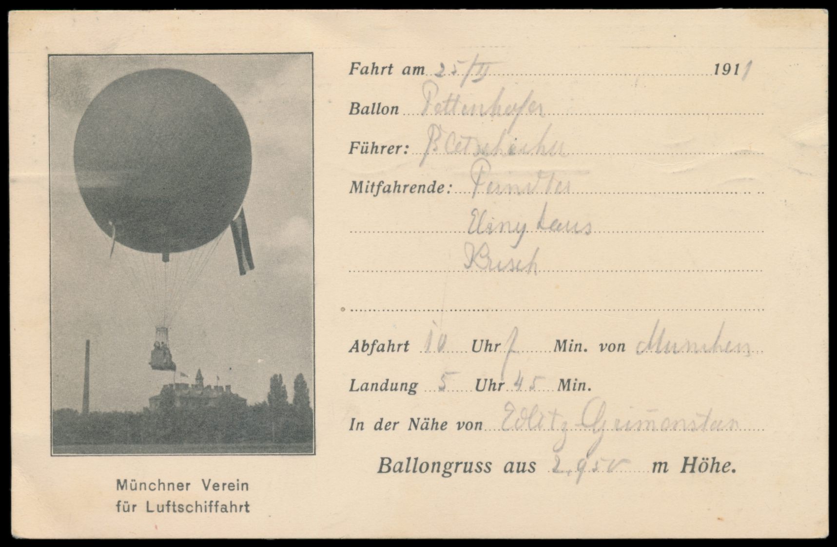 Abwurfkarte "Ballongruss aus 2950 m Höhe ..." des Münchner Verein für Luftschiffahrt, abgeworfen vom Ballon Pettenkofer auf der Fahrt von München nach Edlitz-Grimmenstein, mit vier Unterschriften, Frankatur Österreich 5 h, Stempel Wien 26.2.11, nach Starnberg