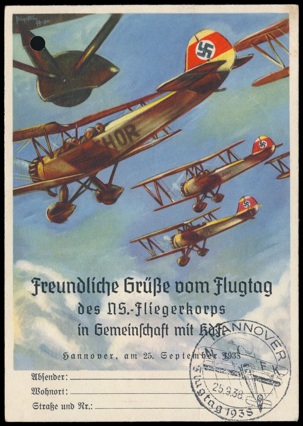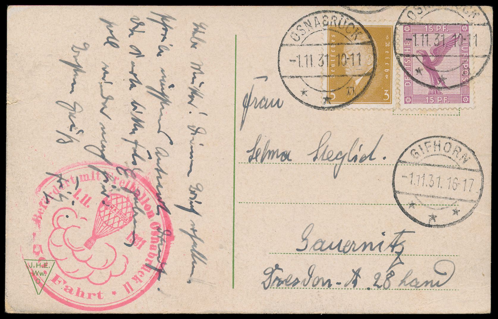 Freiballon Osnabrück II, 3 und 15 Pf. auf Ansichtskarte mit Stempel Osnabrück 1 1.11.31 nach Gauernitz, roter Bestätigungsstempel anlässlich der 50. Fahrt am 1.11.1931, Durchgangsstempel Gifhorn 1.11.31, Bedarf