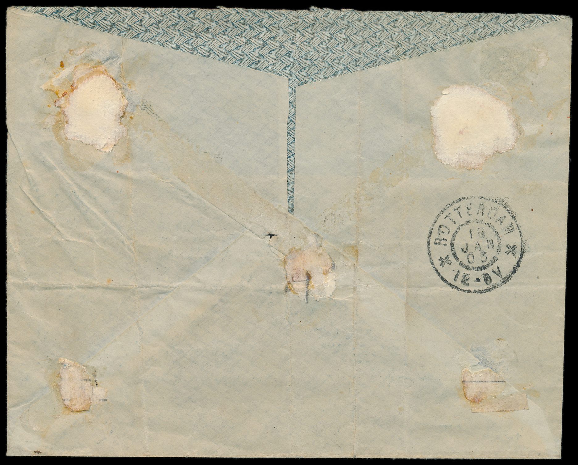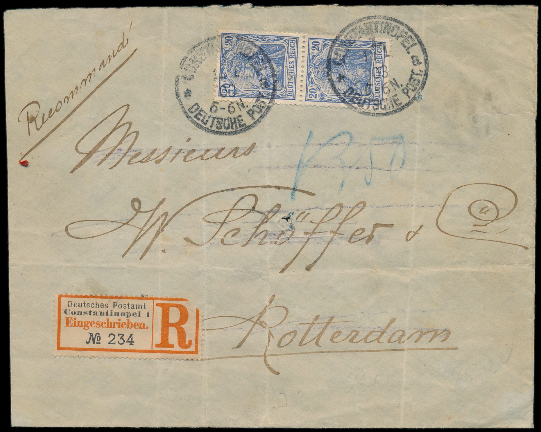 senkrechtes Paar Mitläufer 20 Pf. mit Firmenlochung "BIO" (Banque Impériale Ottomane) auf Einschreibbrief nach Rotterdam, Stempel Constantinopel 1 15.1.03, R-Zettel Einfeldt Nr. 6, Ankunftstempel 19.1.03, Briefklappe fehlt, mehrere senkrechte Büge (einmal durch Marke), rückseitig kleinere Anhaftungen, Bedarf