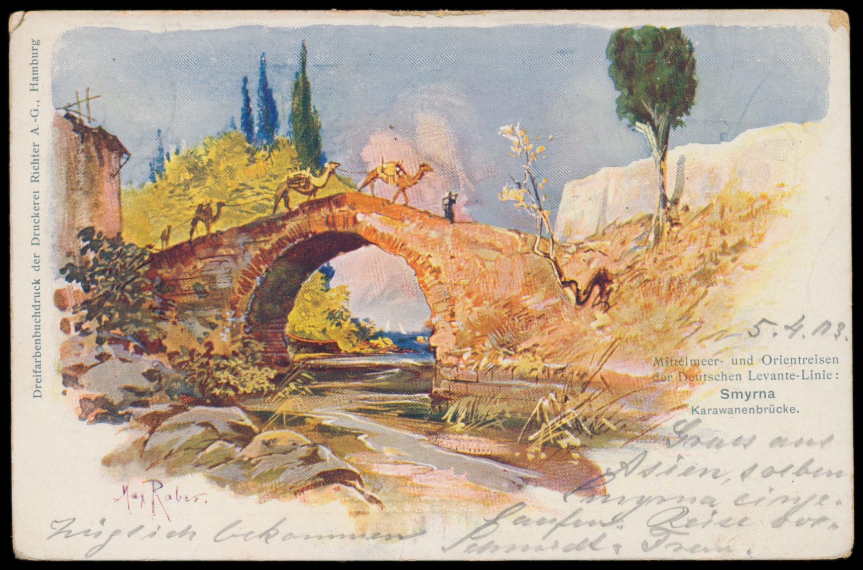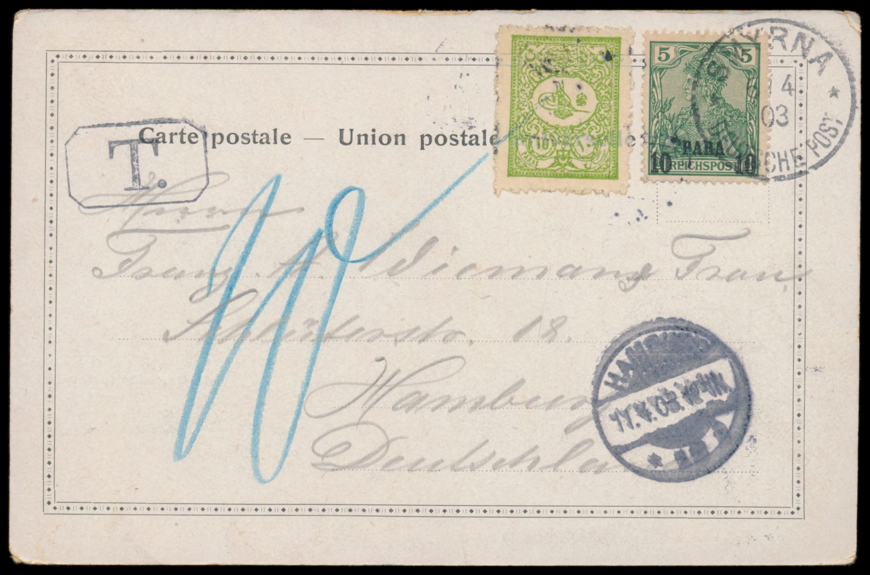 Mischfrankatur D.P. Türkei 10 Para mit Türkei 10 Para auf Ansichtskarte mit Stempel Smyrna 6.4.03 und T.-Stempel, Nachgebühr 10 Pf. wegen ungültiger Türkei-Marke, Ankunftstempel Hamburg 11.4.03, Bedarf