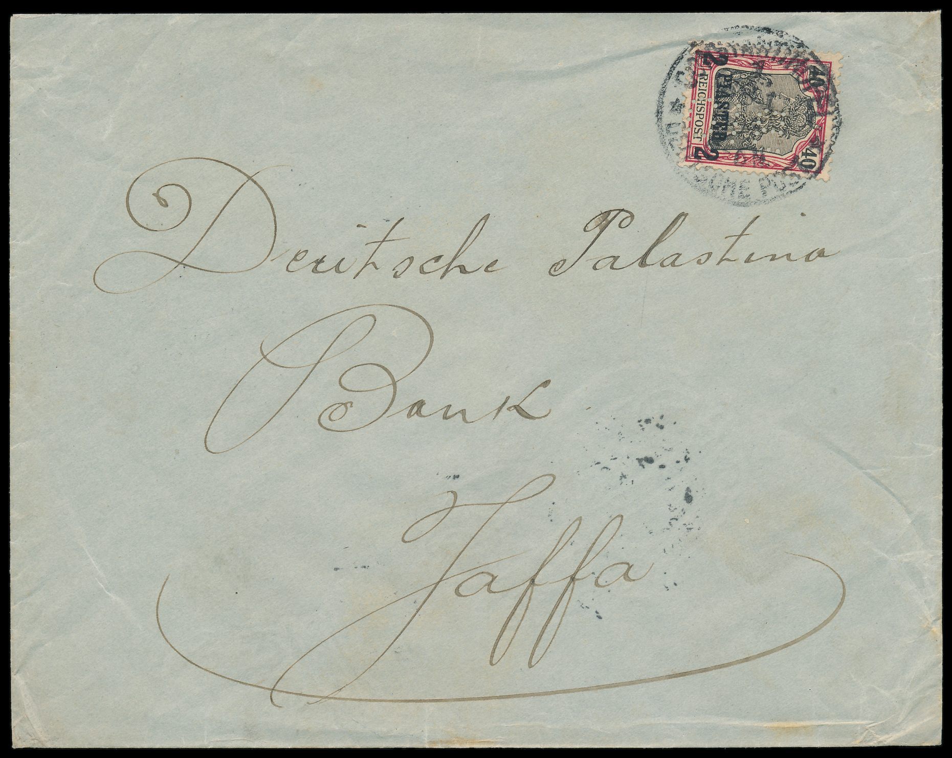 1 Pia. auf Brief mit unbeschädigtem Stempel Jerusalem 6.6. 00 nach Deutschland, rückseitig Absenderstempel "Holzwarenfabrik Ferdinand Fester ... Jerusalem", Ankunftstempel Kupferdreh 15.6.00, nachgesandt nach Bad Nauheim, Ankunftstempel 16.6.00, Bedarf