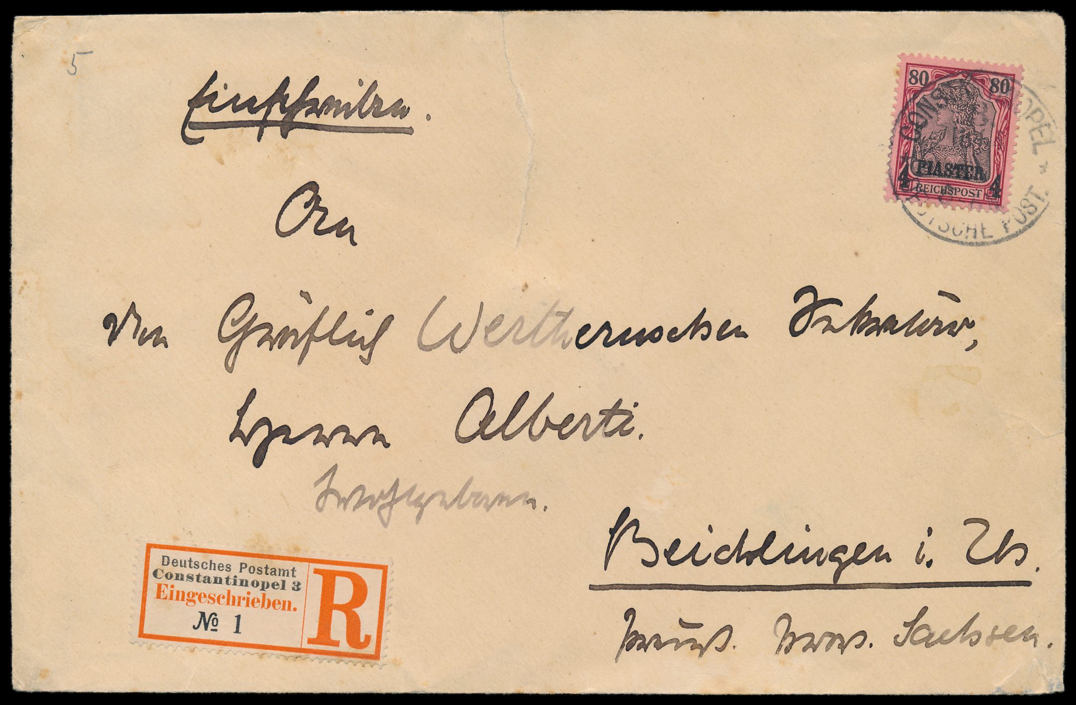 20 Para und 1 1/2 Pia. auf Einschreibbrief mit Stempel Constantinopel 1 a 18.10.02 nach Leipzig, R-Zettel Einfeldt Nr. 6, Ankunftstempel 21.10.02, portorichtig, Bedarf