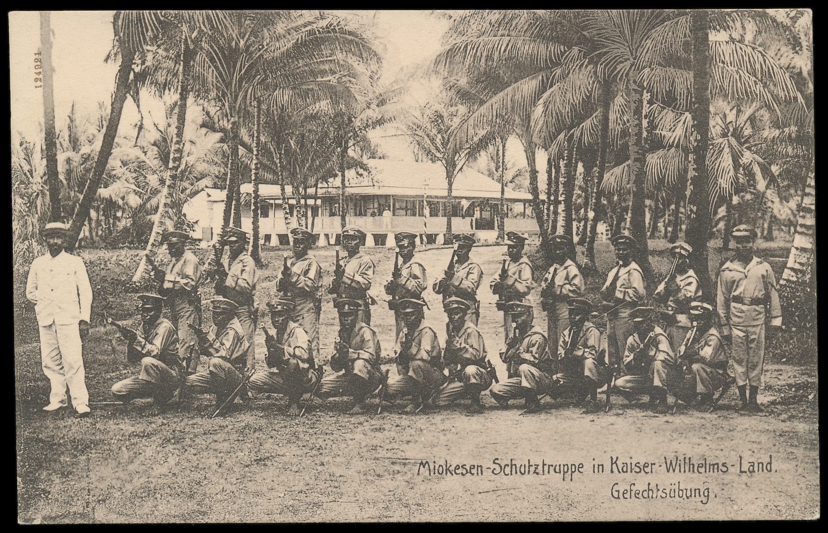 Ansichtskarte Miokesen-Schutztruppe in Kaiser-Wilhelms-Land - Gefechtsübung, ungebraucht, ca. 1912