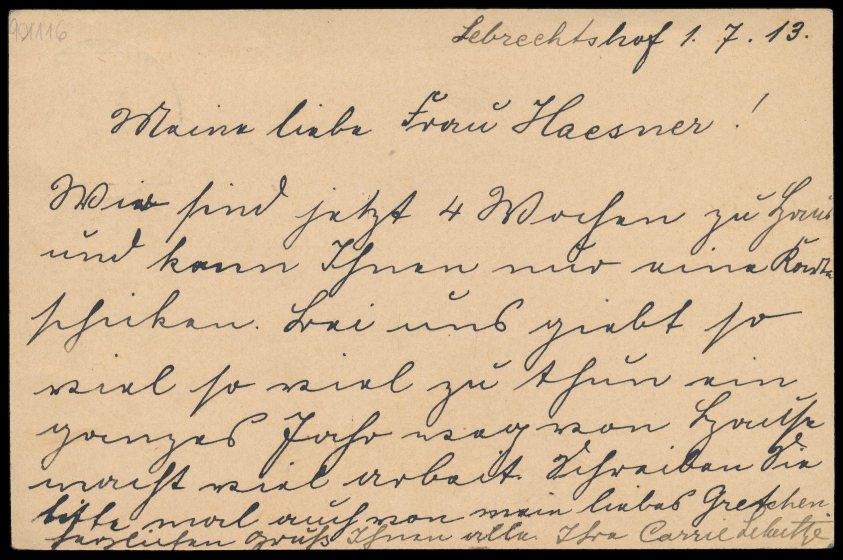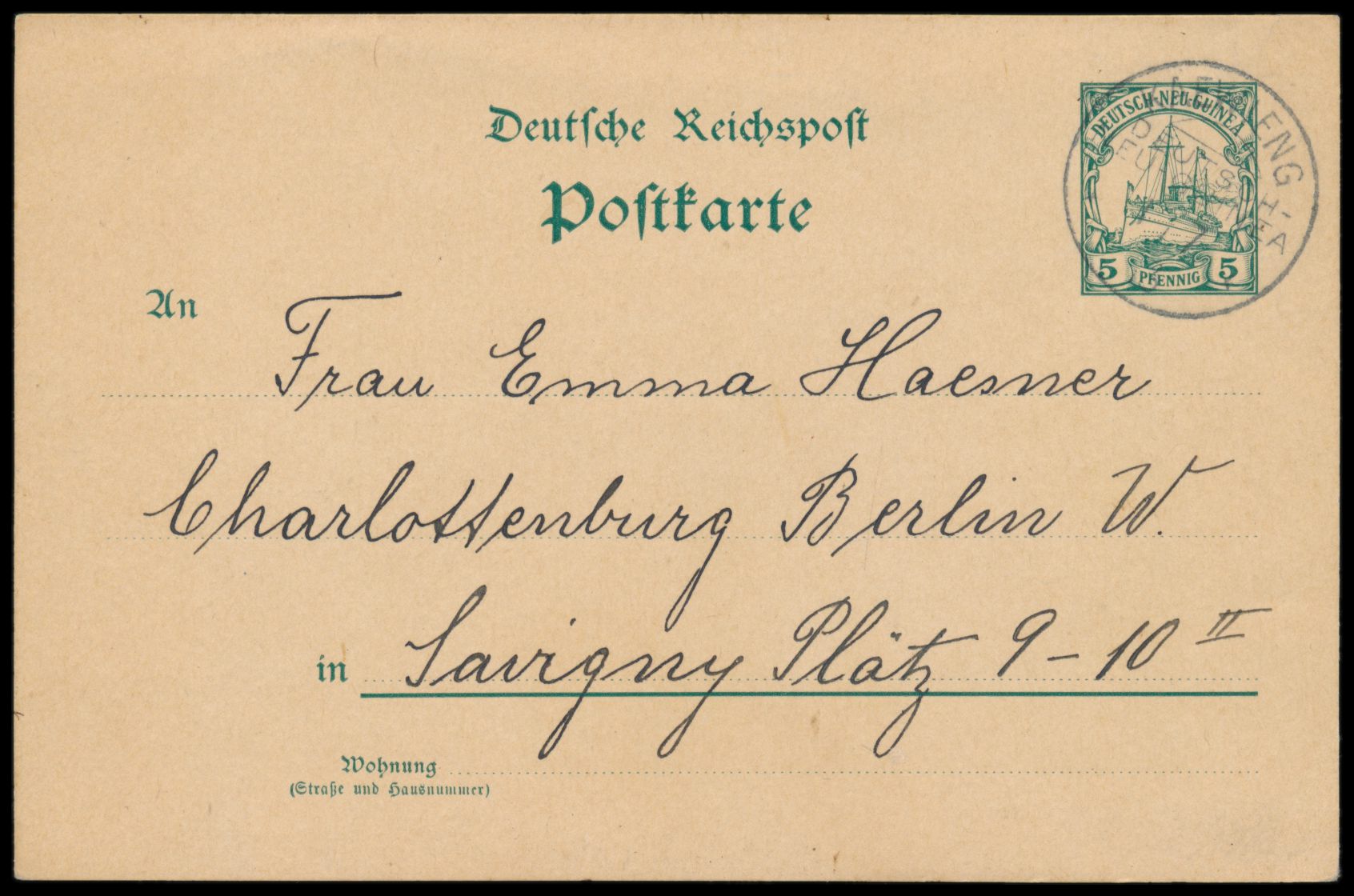 Stempel Kaewieng 1.7.13 auf Ganzsache 5 Pf. nach Berlin, geschrieben "Seebrechtshof 1.7.13", Absender ist Carrie Schultze, Gattin des Plantagenbesitzers Curt Schultze (Plantage Seebrechtshof), Bedarf