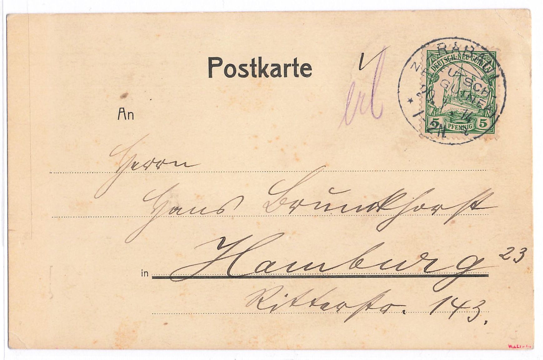 Stempel Rabaul a 20.1.14 auf Postkarte (ohne Ansicht) nach Hamburg, rückseitig Absender "F. König ... Regierungs-Schule", Bedarf