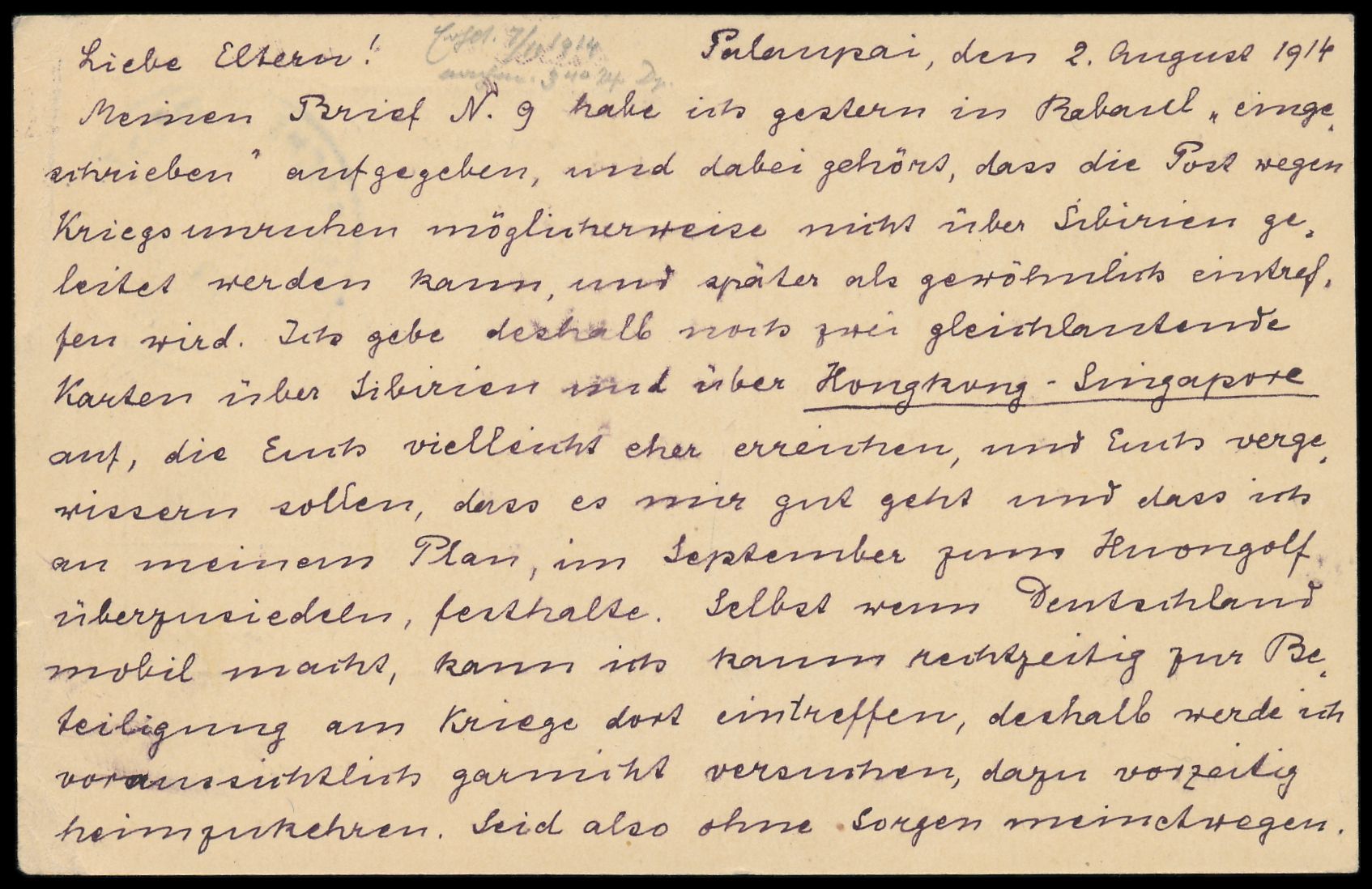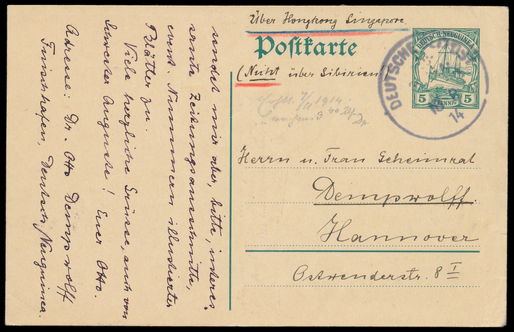 Ganzsache 5 Pf. (mit Teilstrich), geschrieben von Oberstabsarzt Dr. Otto Dempwolff in Palaupei am 2. August 1914, interessanter Text "... Ich gebe deshalb noch zwei gleichlautende Karten über Sibirien und über Hongkong - Singapore auf. ...", diese Karte mit Leitvermerk "Über Hongkong - Singapore (Nicht über Sibirien!)" , Stempel Deutsche Seepost Neu-Guinea-Zweiglinie a 18.8.14 (Abschlag nicht ganz komplett), Dampfer Coblenz, letzter Verwendungstag des Stempels (Postabgabe in Manila), handschriftlicher Eingangsvermerk "7.11.14", Bedarf, in dieser Form vermutlich Unikat